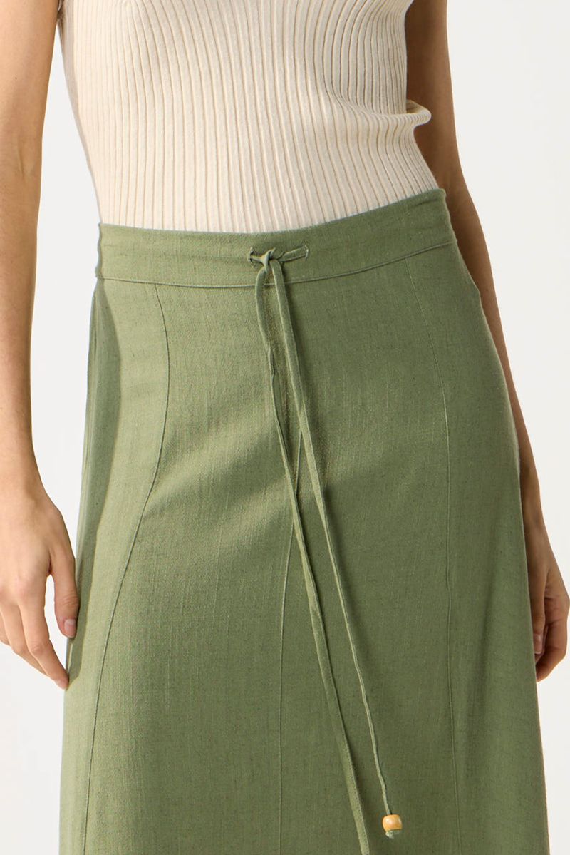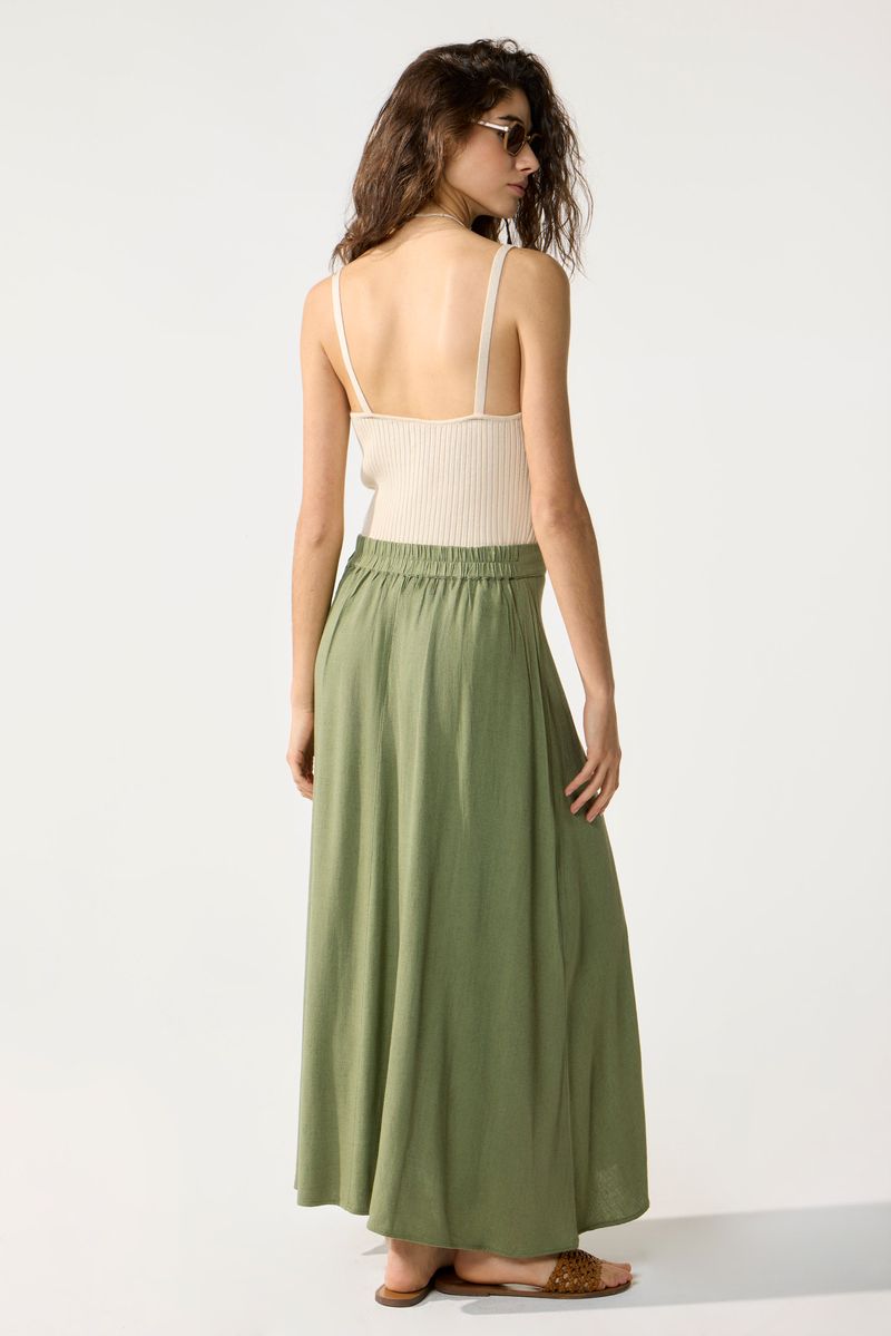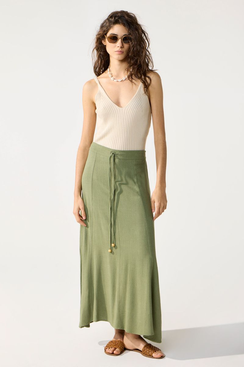 Falda larga evase en lino, cintura con lazo y cintura espalda elastizada.Tiene recortes en delantero. La modelo está usando talle 42. Composicion: 80% Rayón viscosa | 20% Lino