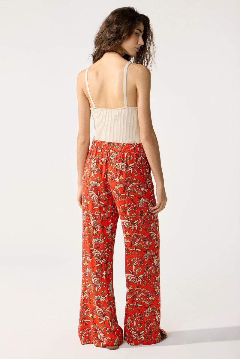 Palazzo en crepe estampado .Cintura elastizada con lazo para atar y terminación con tanca. Tiene bolsillos delanteros y tajo en ruedo. La modelo está usando talle 42. Composición: 100% Rayón viscosa
