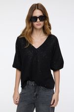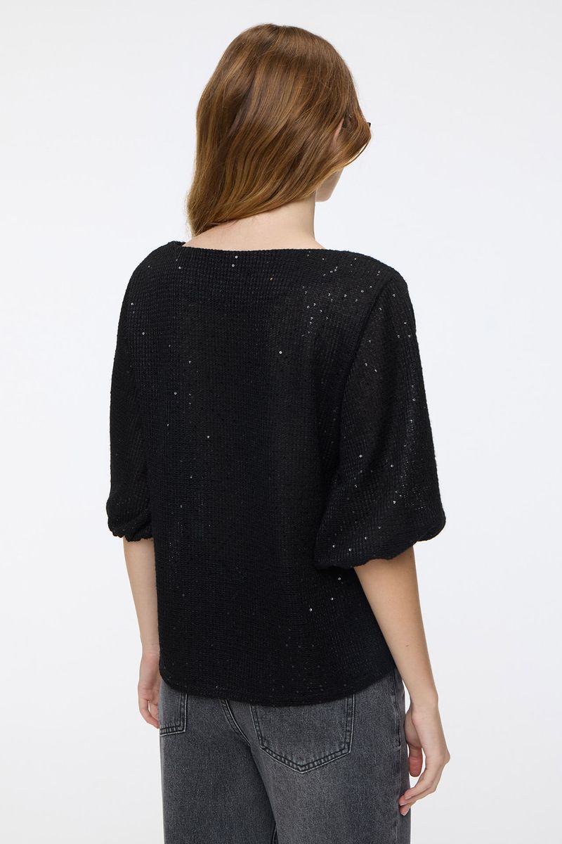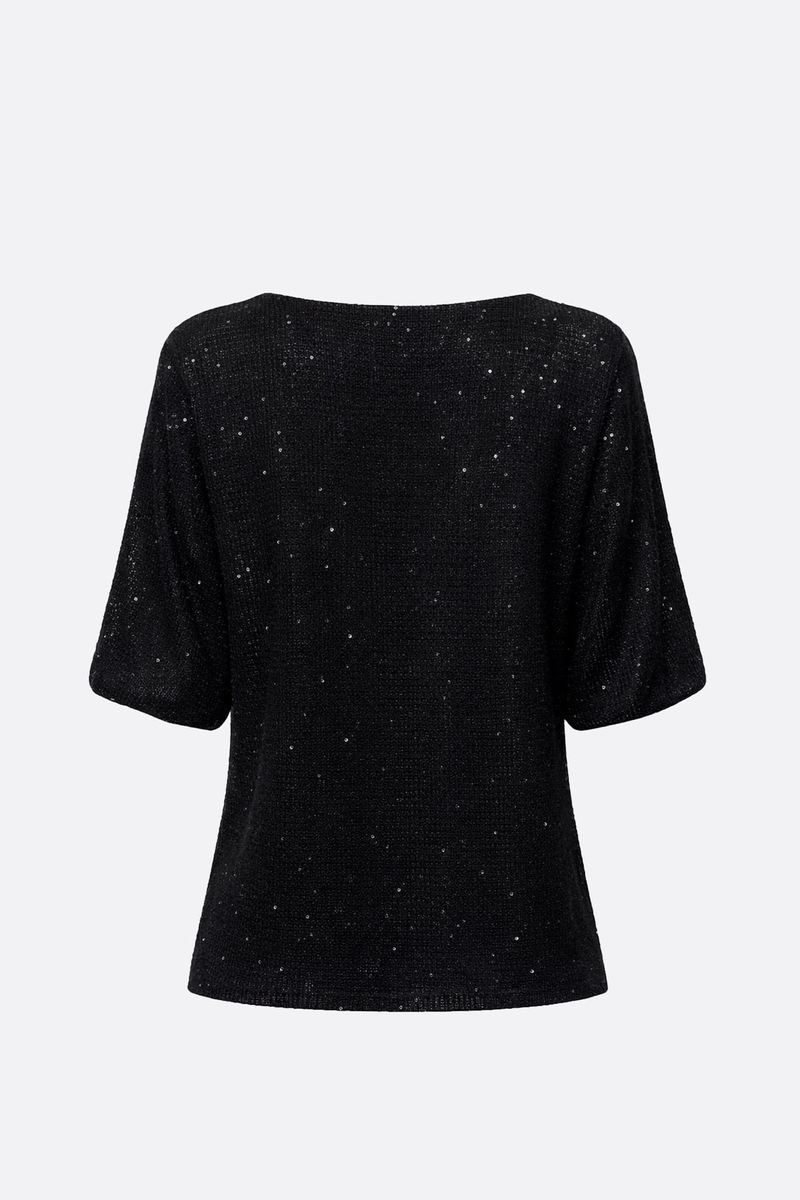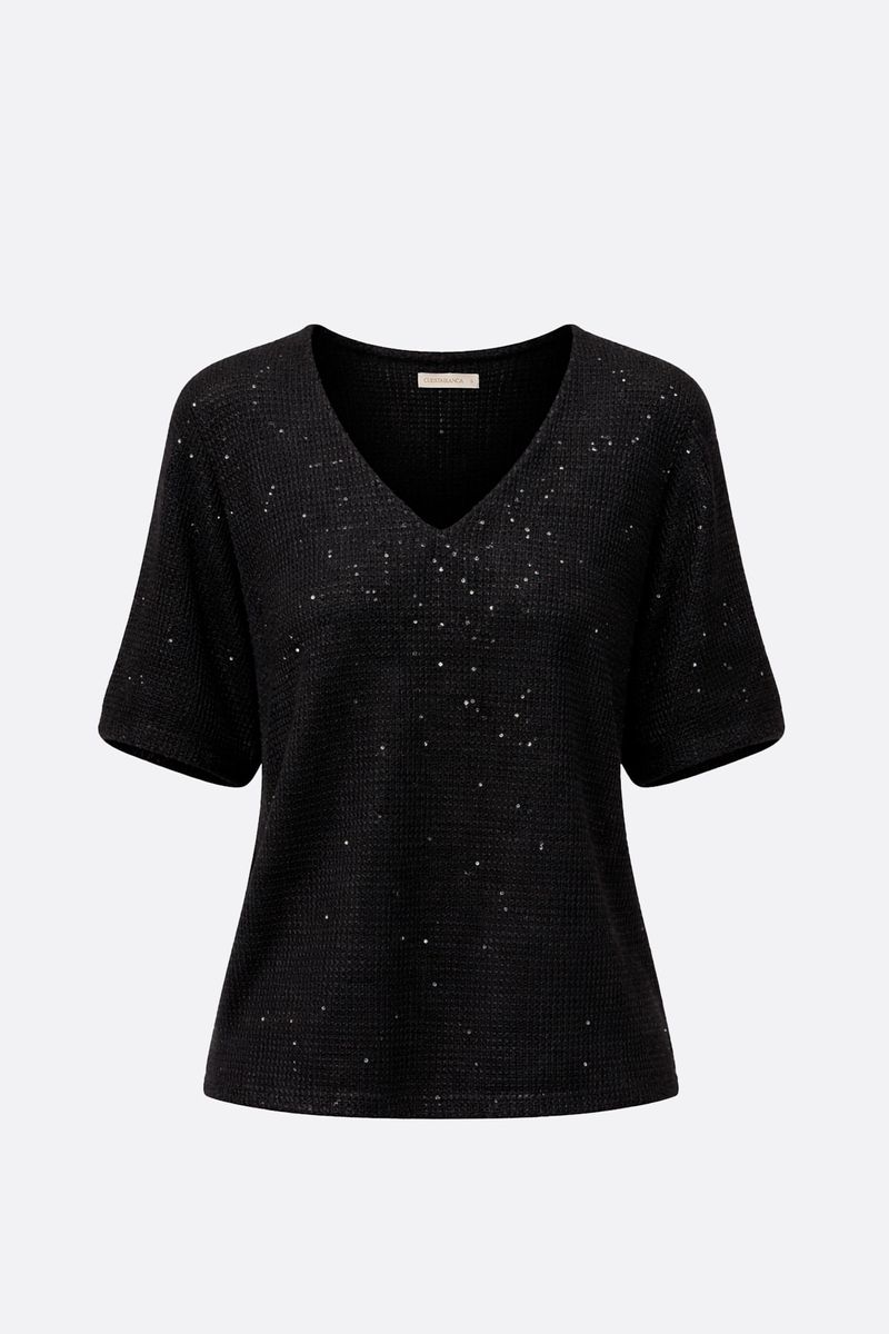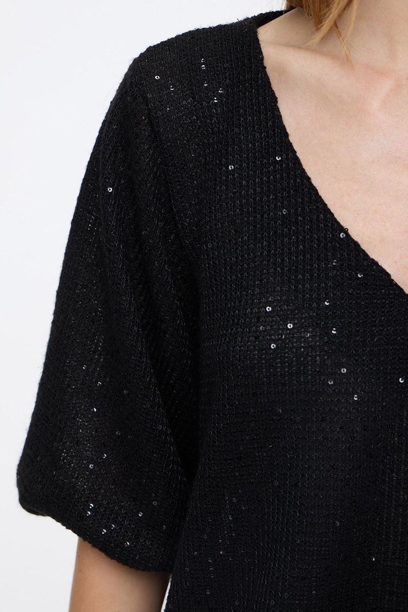 Sweater en lanilla con lentejuelas, escote en V y mangas 3/4 lleva elástico en puños con frunce. La modelo está usando talle 42. Composición: 94% Poliéster | 6% Rayó viscosa
