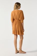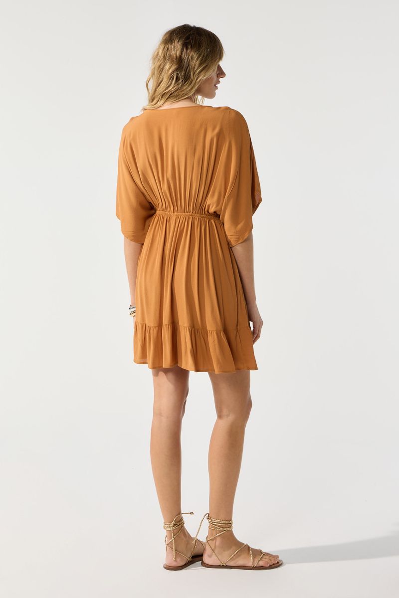Vestido corto en crepe, escote en V con lazo entrelazado y manga corta al codo.Tiene cintura elastizada y faldón con volado. La modelo está usando talle 42. Composición: 100% Rayón viscosa