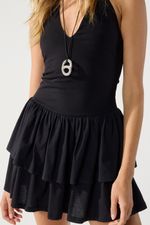 Vestido corto con top al cuerpo, escote en V con vista interna y breteles con elástico. Tiene falda con volados en jersey de algodón. La modelo está usando talle 42. Composición: 100% Poliester