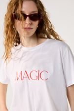 Remerón liso en jersey escote redondo y mangas corta. Tiene tajo en laterales y estampa única en centro delantero. La modelo está usando talle 42/44. Composición: 100% Algodón
