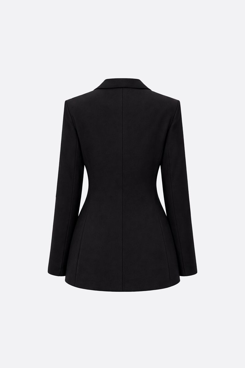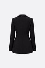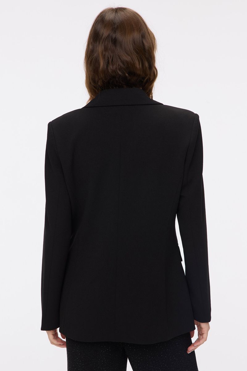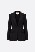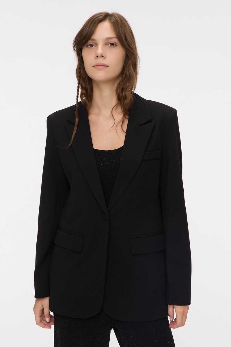 Blazer forrado con solapas. Tiene bolsillos con tapa y un bolsillo falso en el pecho. Apertura en el frente con un botón. La modelo está usando talle 42. Composición: Tela Principal: 95% Poliéster | 5% Elastano || Forrería: 100% Poliéster