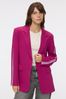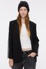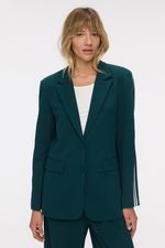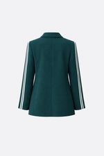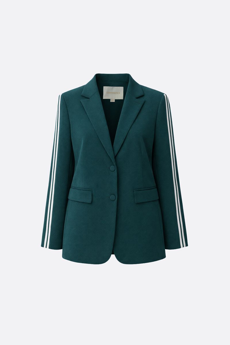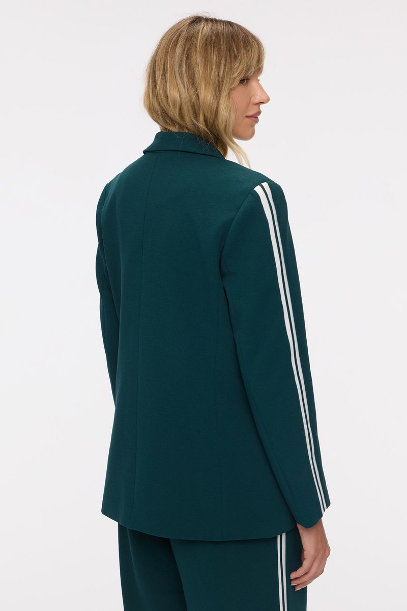 Blazer forrado, con solapas y bolsillos con tapa en los laterales. Cierre frontal con botones forrados. Tiene un detalle de dos líneas blancas estilo deportivas a lo largo en las mangas. La modelo está usando talle 42. Composición: Tela Exterior: 95% Poliéster | 5% Elastano || Forrería: 100% Poliéster