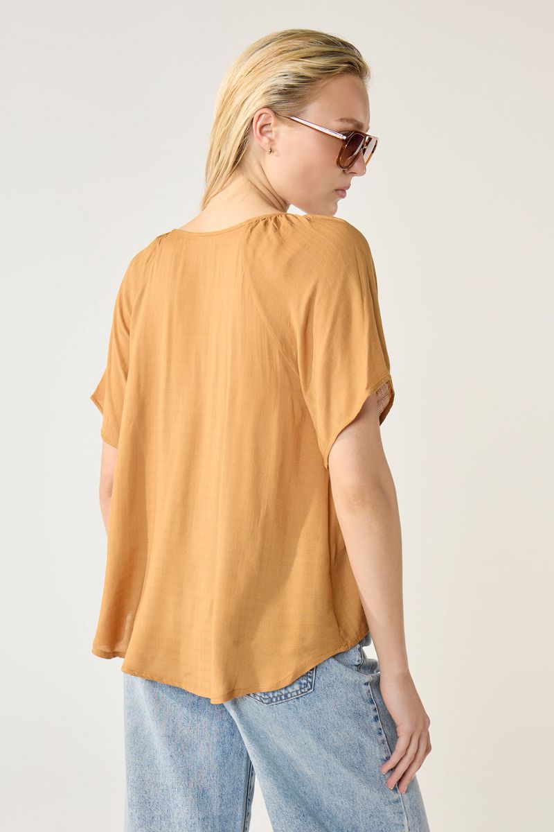 Blusa lisa en dobby, escote con frunces y abertura con terminación envivado y manga ranglán corta. Tiene largo modular irregular con terminación de ruedo espalda en curvo. La modelo está usando talle 42. Composición: 100% Rayón viscosa