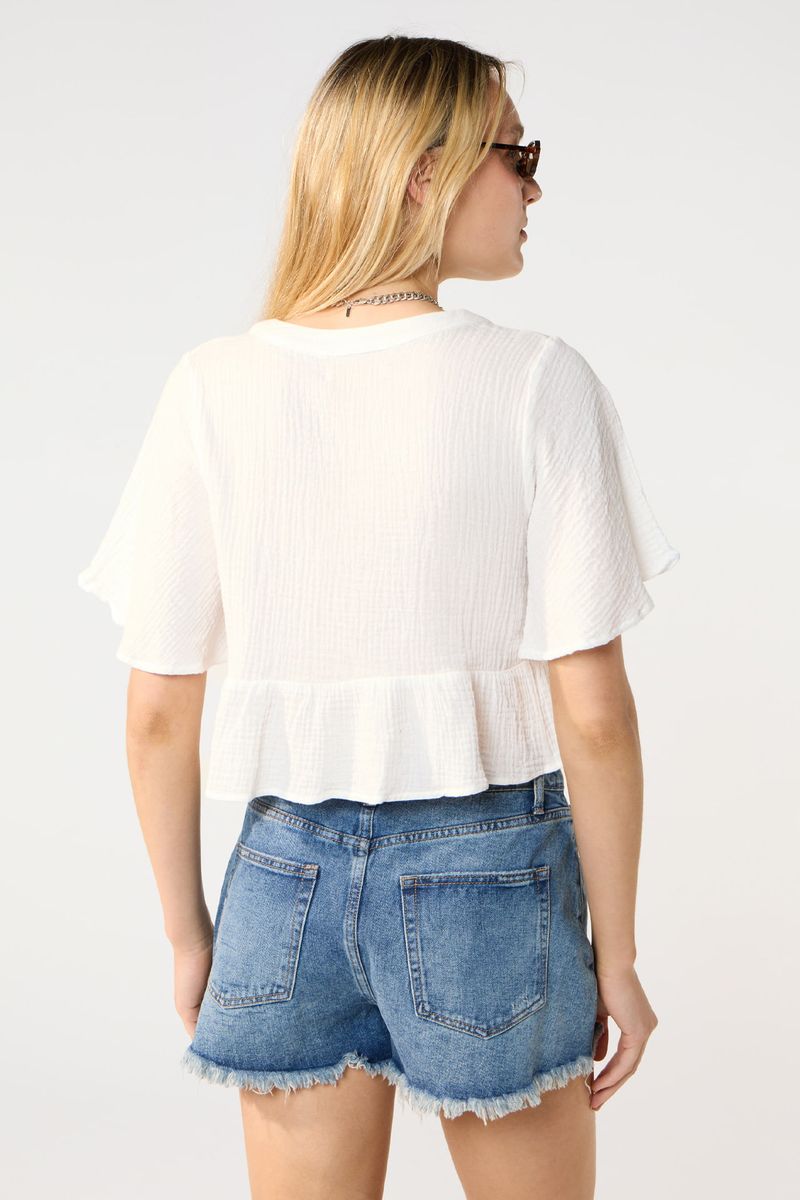Blusa fresca con mangas acampanada de algodon texturizado. La modelo está usando talle 42. Composición: 100% Algodón