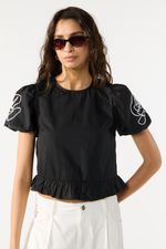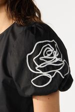 Blusa en poplin de algodón. Tiene mangas amplias embolsadas con bordado a contratono. Tiene ruedo con frunce. La modelo está usando talle 42. Composición: 100% Algodón