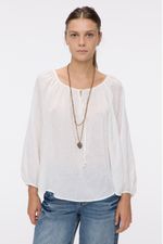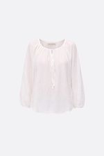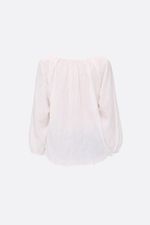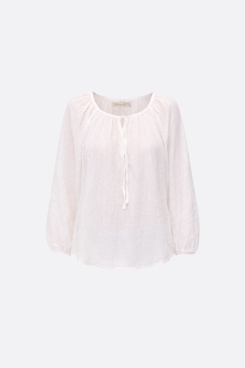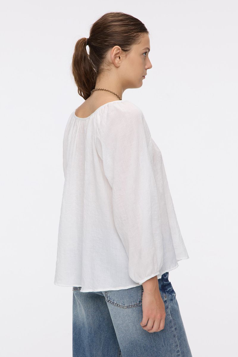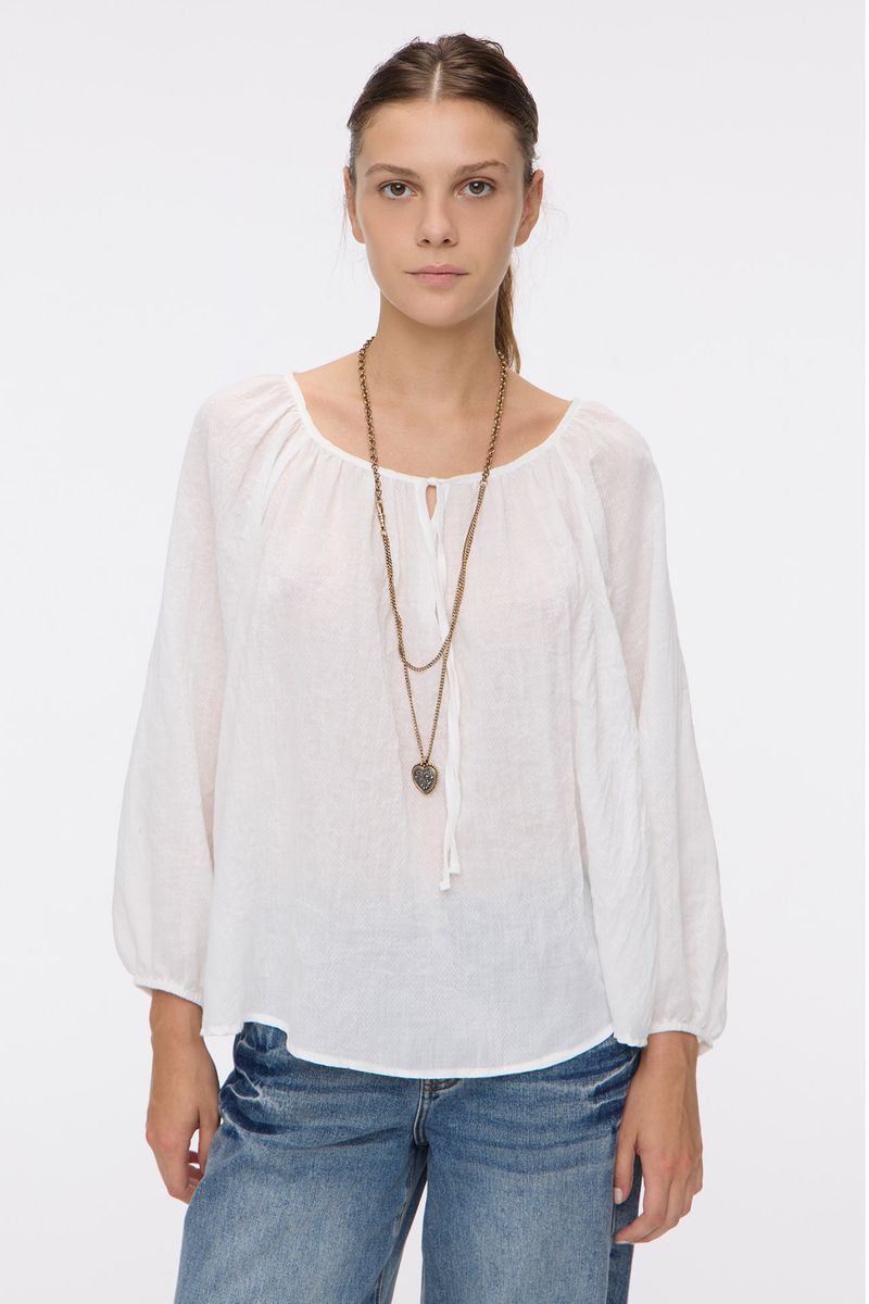 Blusa en algodón liviano con textura espigas. Tiene frunces en escote y lazo para atar, con abertura en V en el centro del escote. Lleva elástico en puños. La modelo está usando talle 42. Composición: 65% Poliéster | 35% Algodón