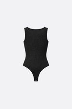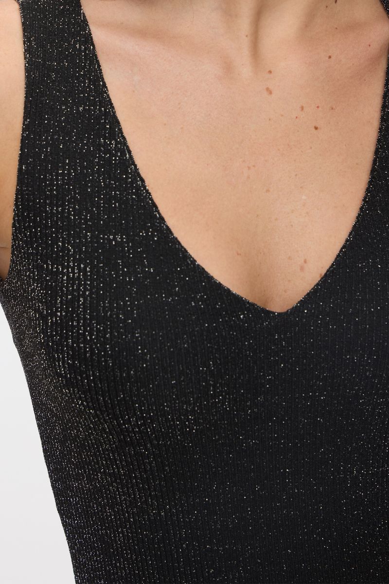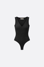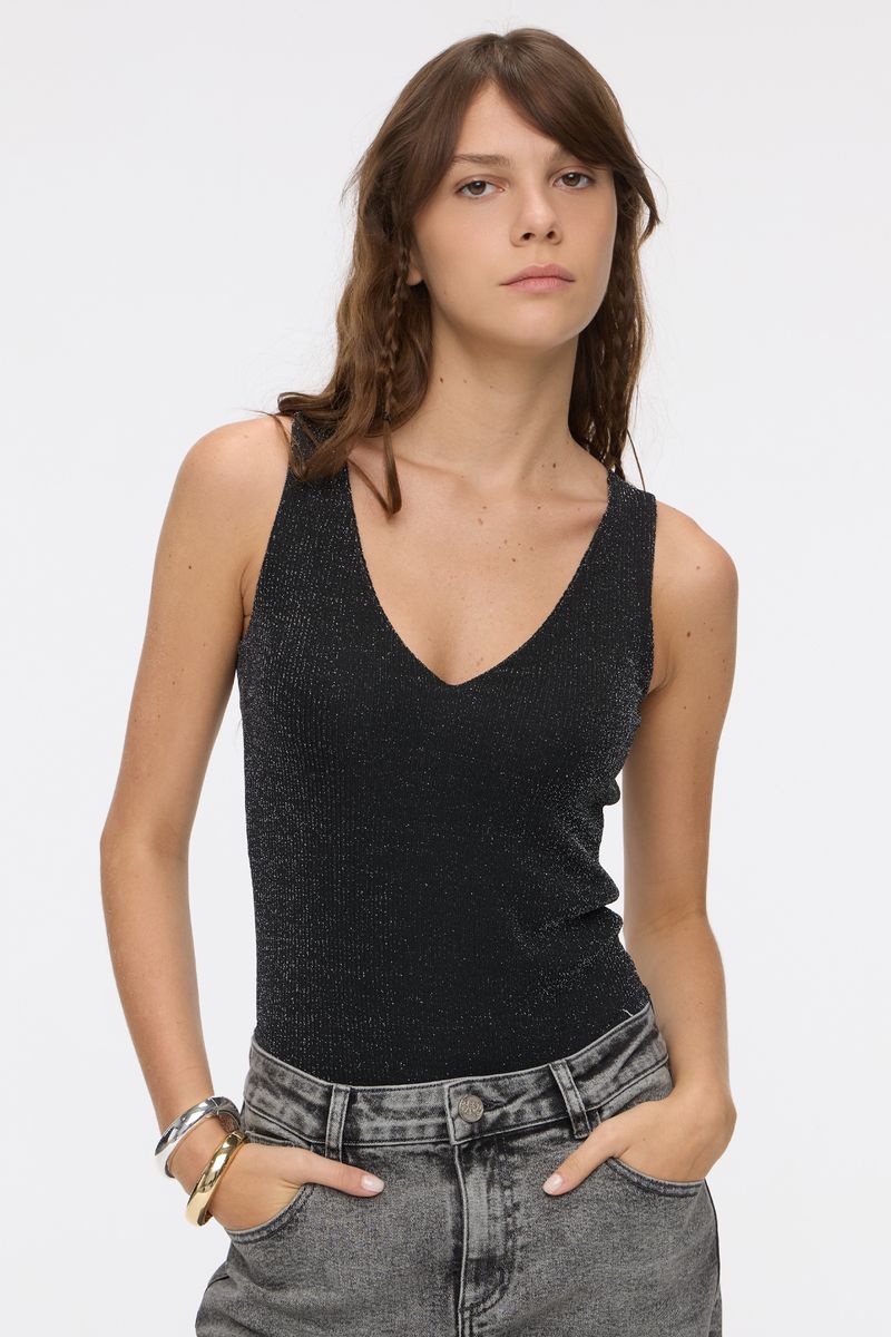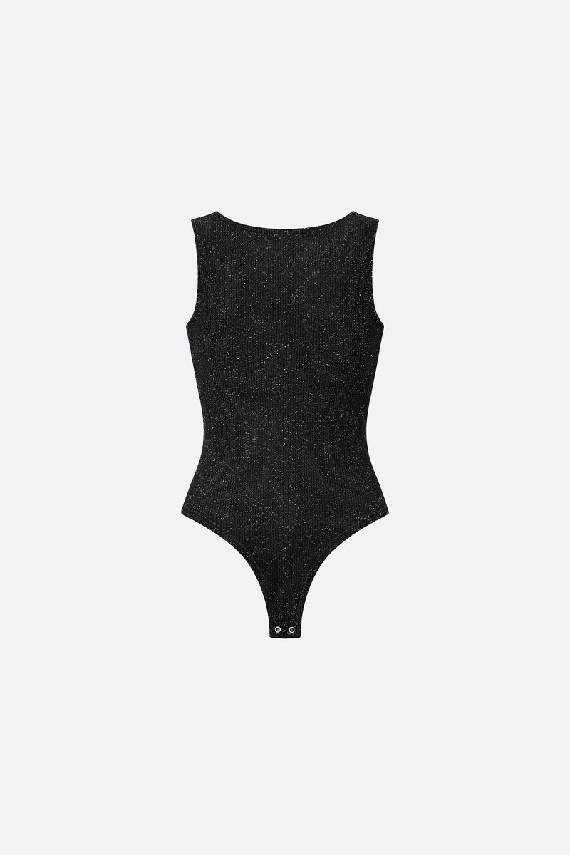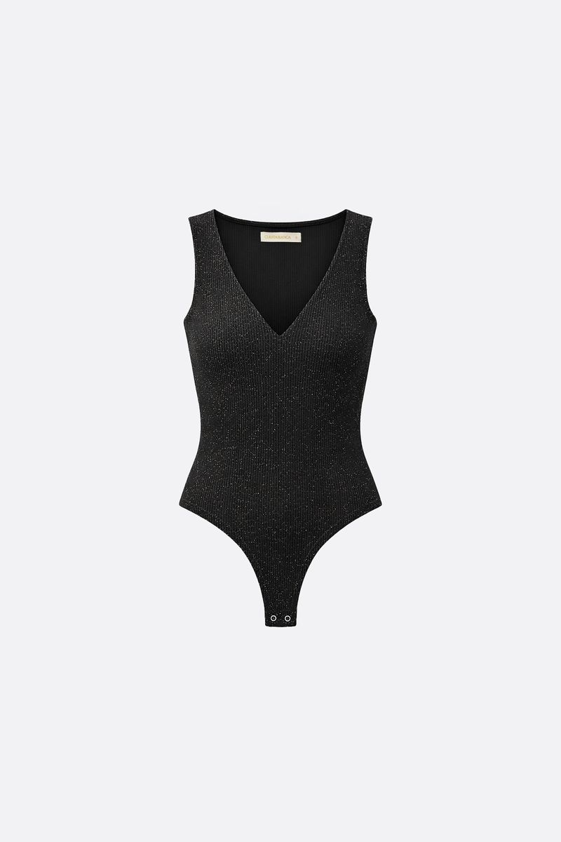 Body musculosa en jersey con lurex y escote en V . Tiene broche snap de acceso en tiro. La modelo está usando talle 42. Composición: 60% Nylon | 32% Lurex | 8% Elastano