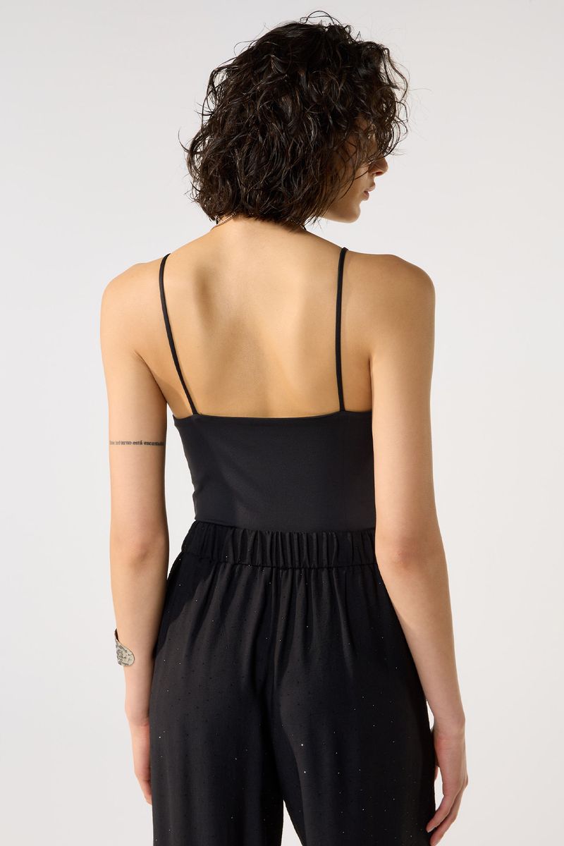 Body de microfibra con breteles finos regulables , escote redondeado profundo y espalda cavada. Incluye también botones a presion en la entrepierna. La modelo está usando talle 42. Composición: 91% Poliamida | 9% Elastano