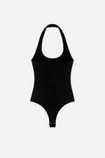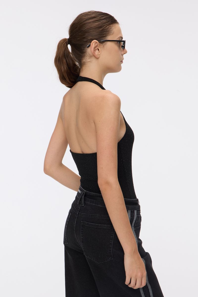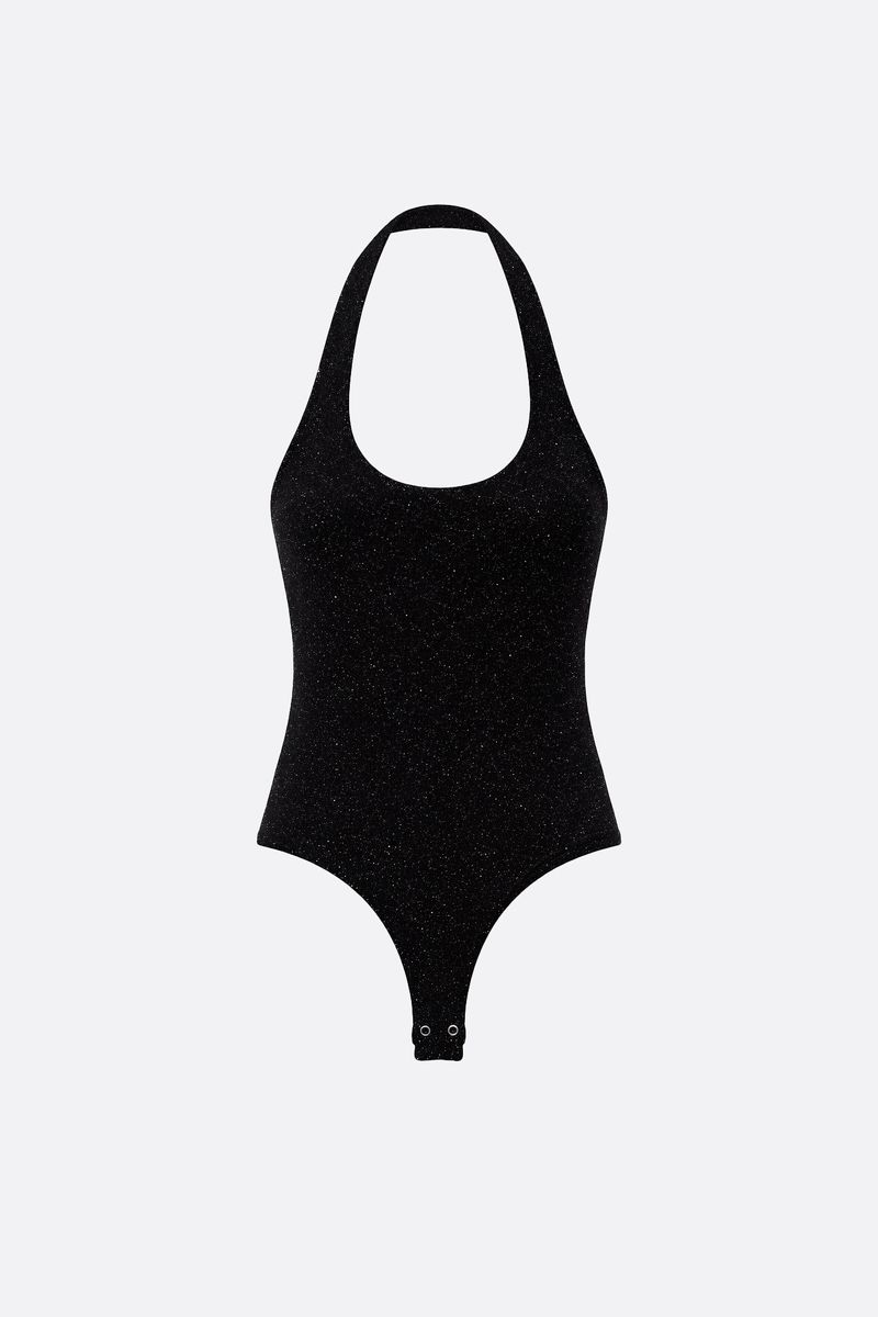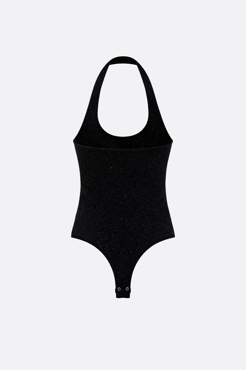 Body en jersey con lurex y hotfix, tiene escote en v redondeado y lleva broches snap de acceso en tiro. La modelo está usando talle 42. Composición: 60% Nylon | 32% Lurex | 8% Elastano