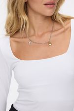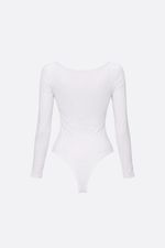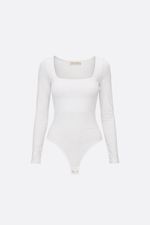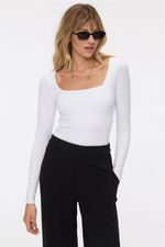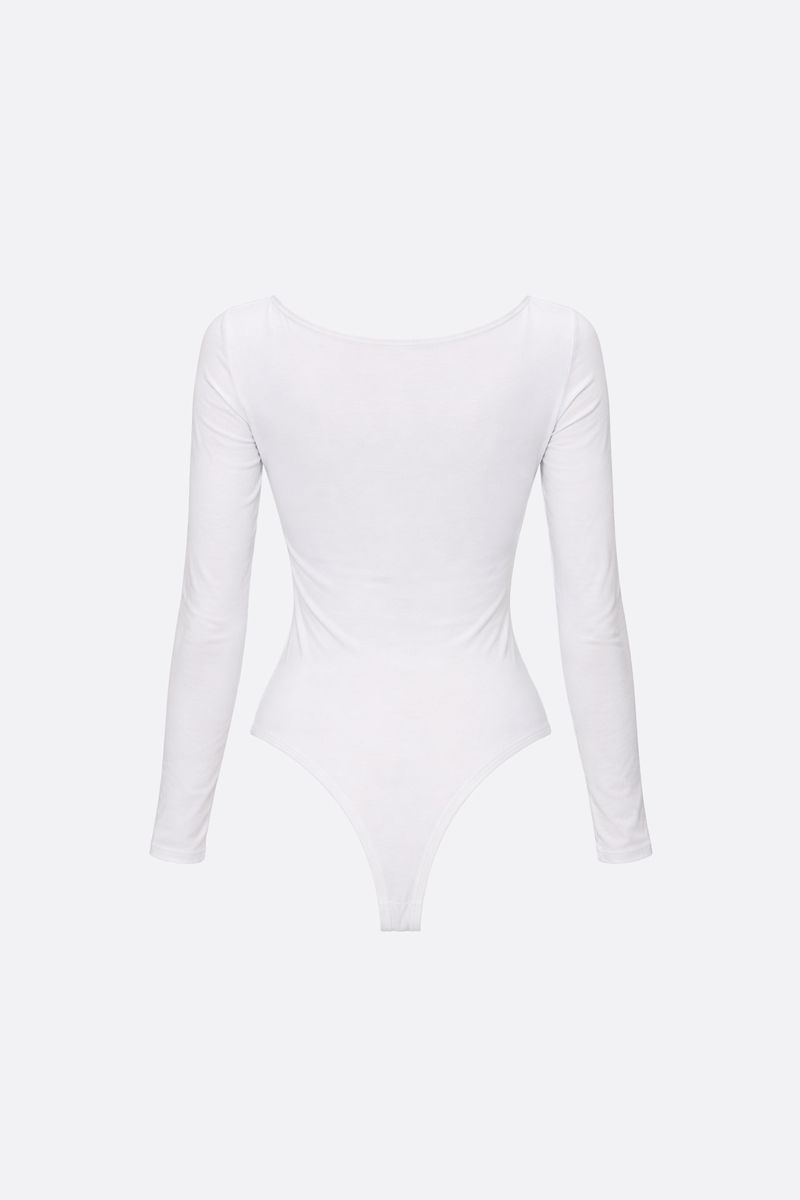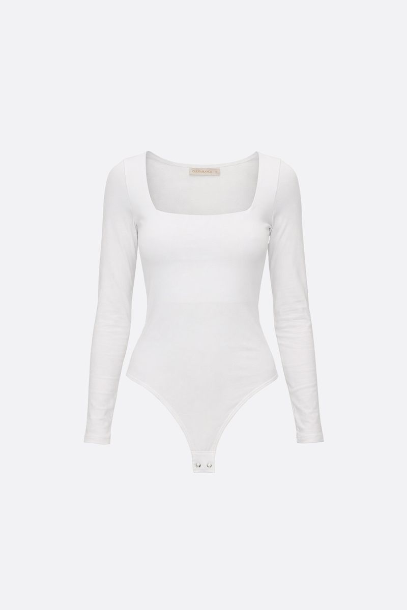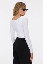 Body remera manga larga en jersey, escote recto con vista interna. Tiene broches snap en tiro. La modelo está usando talle 42. Composición: 93% Algodón | 7% Elastano