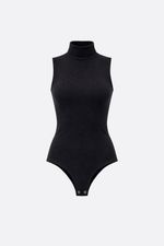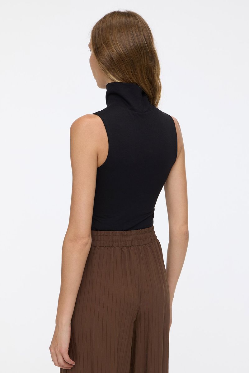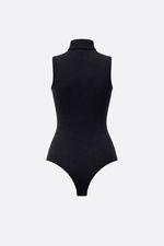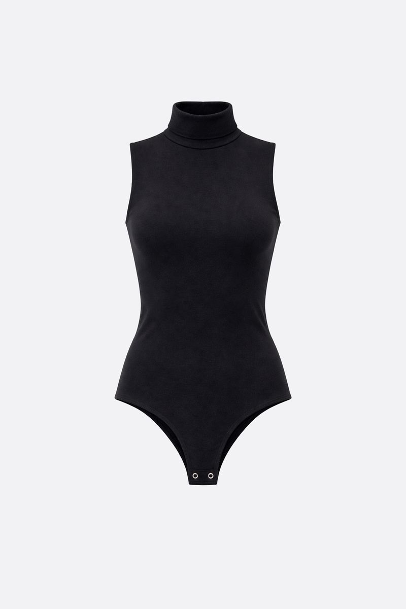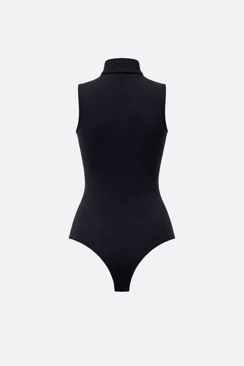 Body musculosa en jersey con cuello polera. Tiene broches snap en entrepierna. La modelo está usando talle 42. Composición: 93% Algodón | 7% Elastano