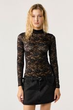 Body en encaje tipo polera con mangas largas, acceso en entrepierna. La modelo está usando talle 42 Composición: 88% Poliamida | 12% Elastano