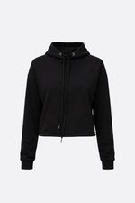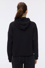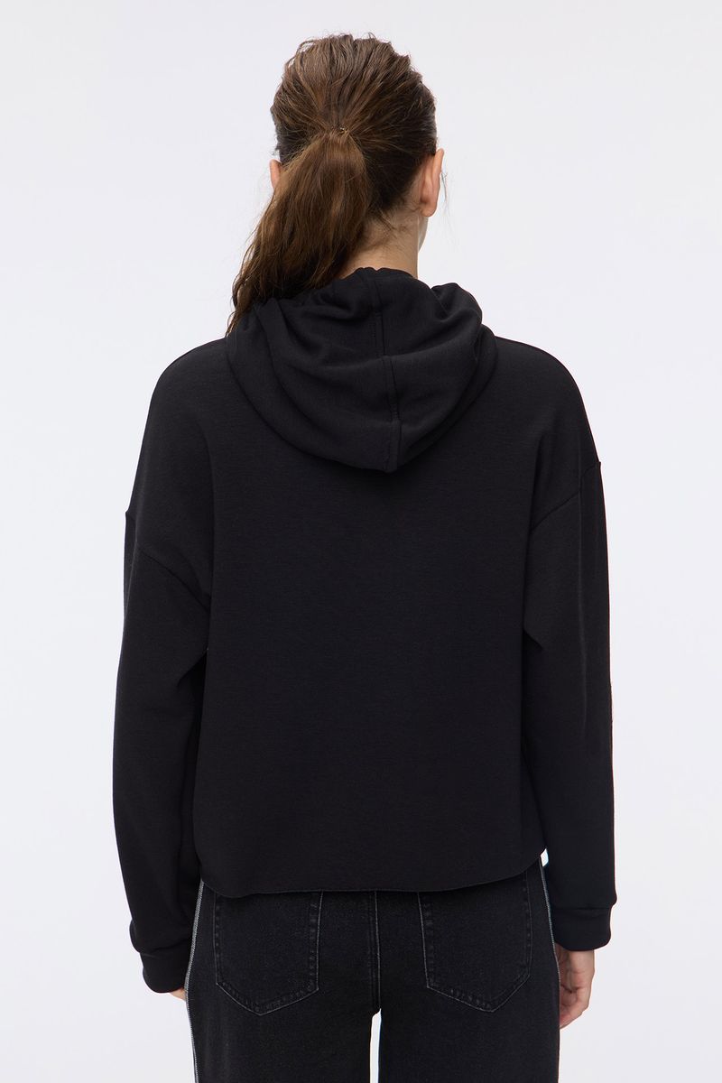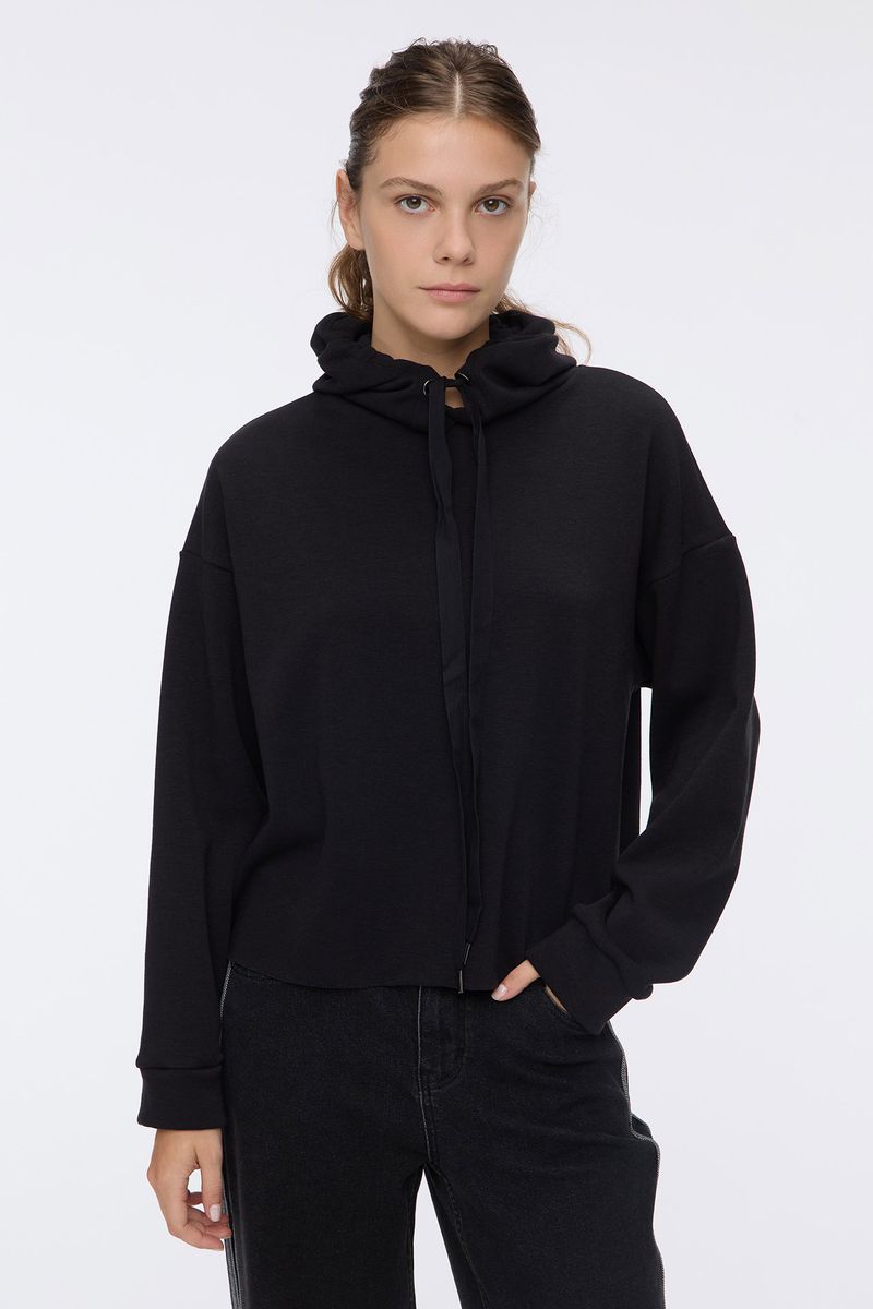 Buzo en rustico con interior forrado en símil piel, tiene capucha con cordón y terminación de ruedo al corte. La modelo está usando talle 42. Composición: 75% Poliéster | 21% Algodón | 4% Elastano