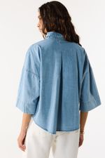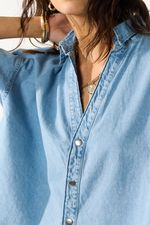 Camisa de denim color azul con proceso de lavado .Costura con pespunte a contratono color camel. Cartera central con broches metalicos, manga 7/8 y pinza central trasera. La modelo está usando talle 42. Composición: 100% Algodón