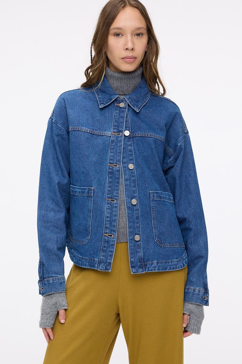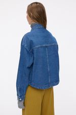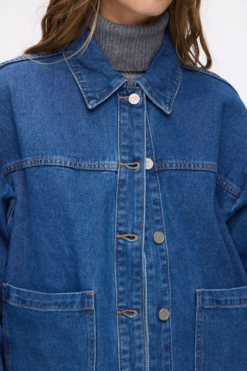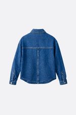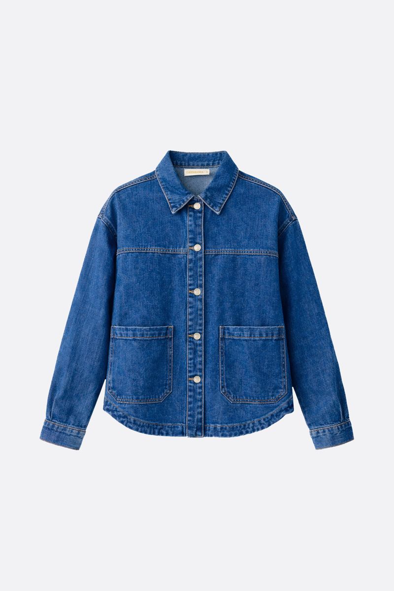 Camisaco denim azul con proceso de lavado. Acceso frontal con botones metalicos. Bolsillos plaqué inferiores. Hilo a tono color azul. La modelo está usando talle M. Composición: 88% Algodón | 12% Poliéster