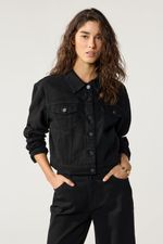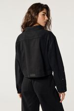 Campera de bull negra con bolsillos delanteros, detalle de diseño calado floral en ambas mangas bordado color Negro. Calce ajustado de largo hasta la cintura. Hilo de confeción al tono. La modelo está usando talle 42. Composición: 100% Algodón