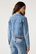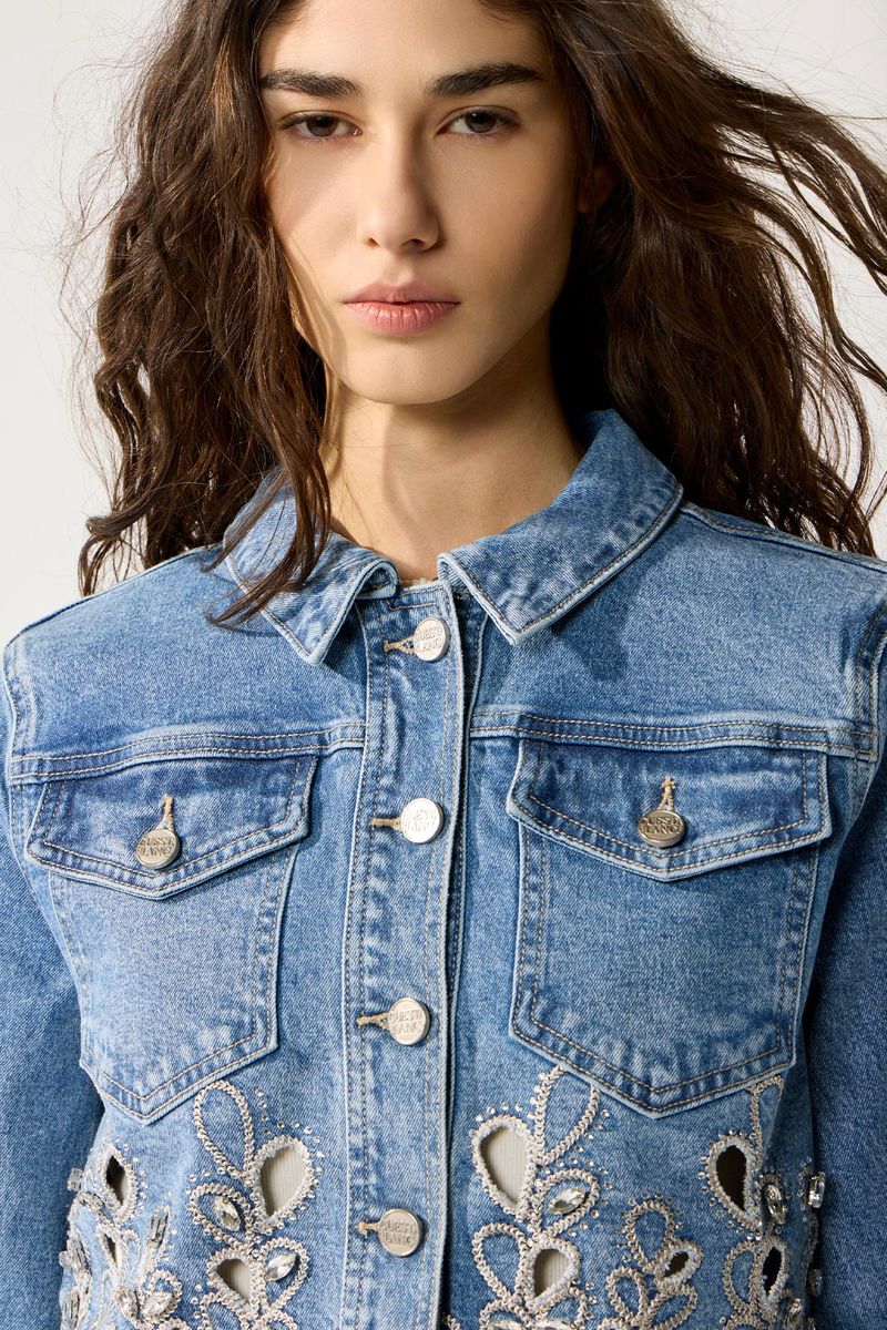 Campera de denim azul claro con proceso de lavado con bolsillos delanteros, detalle de diseño calado floral en el delantero hacia el ruedo con hilo a contratono color camel. Detalle de piedras en diferentes tamaños acompañando el diseño. Calce ajustado de largo hasta la cintura. Hilo de confección a contratono. La modelo está usando talle 42. Composición: 96% Algodón | 3% Poliéster | 1% Elastano