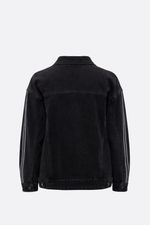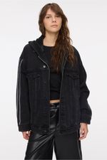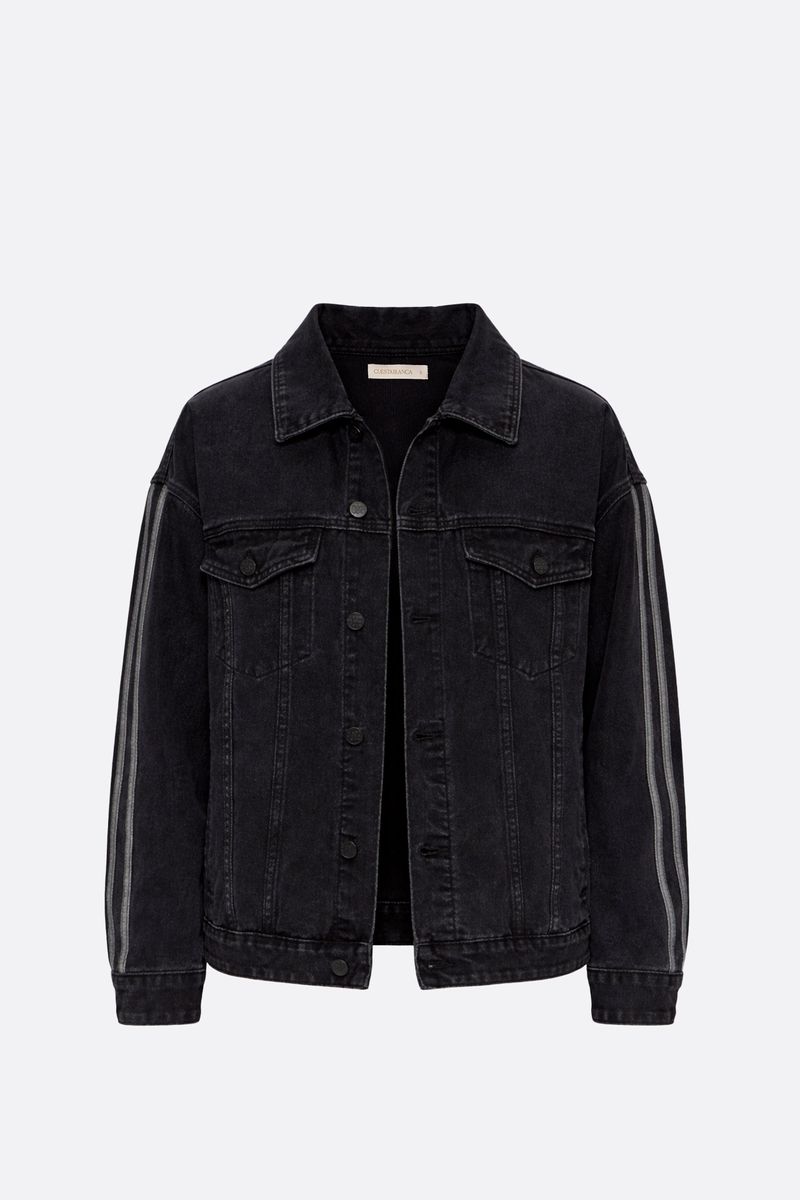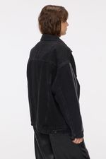 Campera de Denim rígido color negro con calce oversize. Largo modular por debajo de la cadera. Posee bolsillos delanteros y detalle de 2 cintas a contratono en ambas mangas. Acceso central con botones. La modelo está usando talle 42. Composición: 88% Algodón | 12% Poliéster