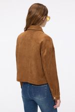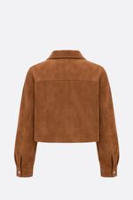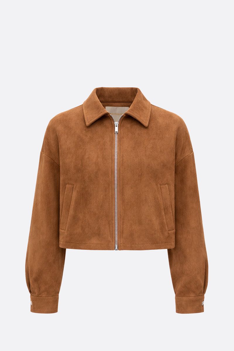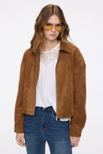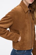 Campera en gamuza ecológica, forrada. Detalle de botones metálicos snaps en los puños y cierre metálico en el acceso delantero. La modelo está usando talle 42. Composición: Tela Exterior: 96% Poliéster | 4% Elastano || Forrería: 100% Poliéster