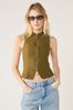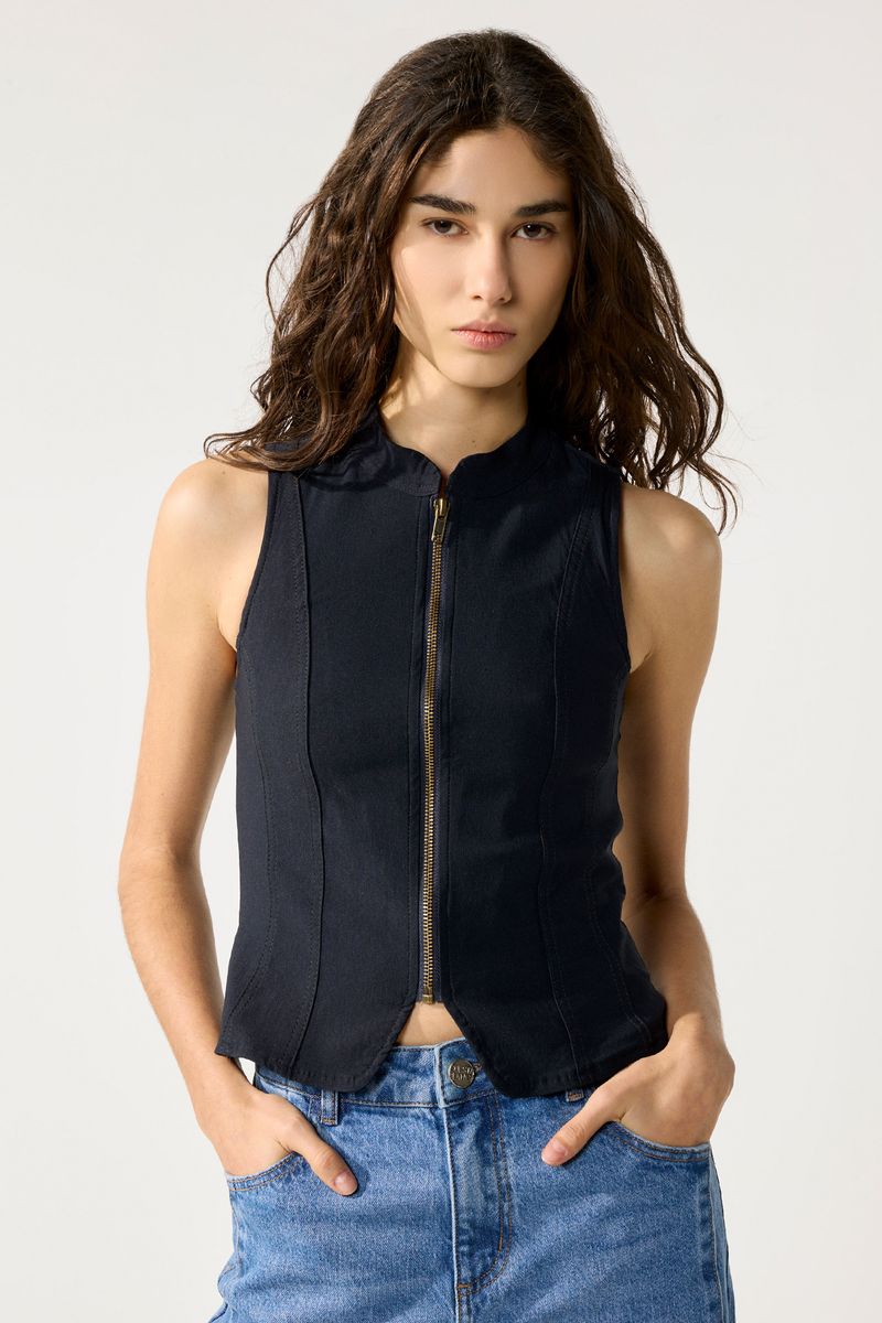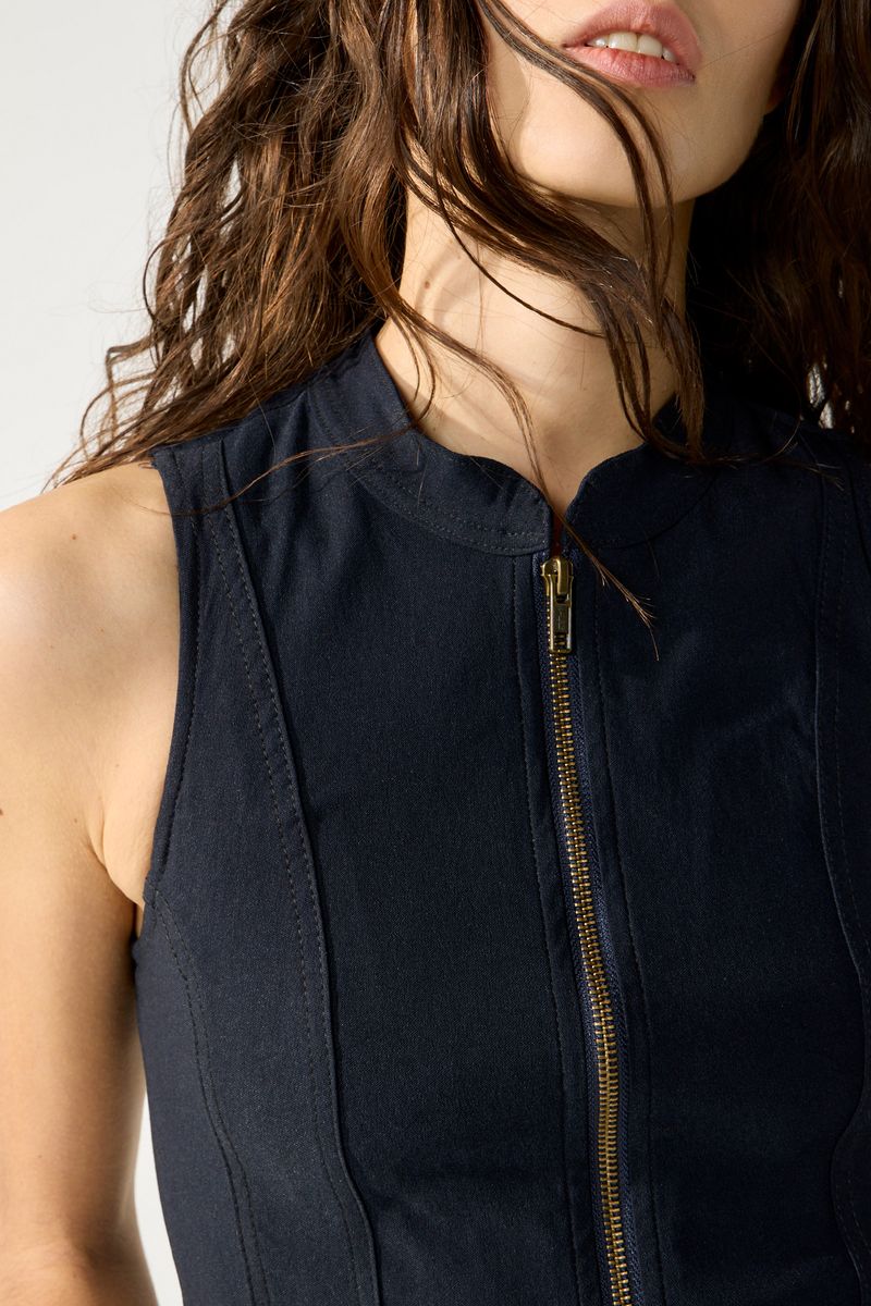 Chaleco al cuerpo en bengalina con cuello mao y cierre desmontable. Tiene recortes de entalle. La modelo está usando talle 42. Composición: 73% Rayón viscosa | 23% Poliéster | 4% Elastano