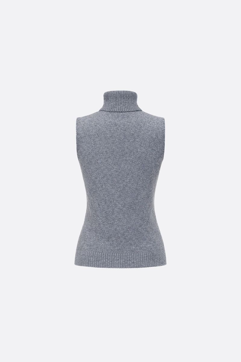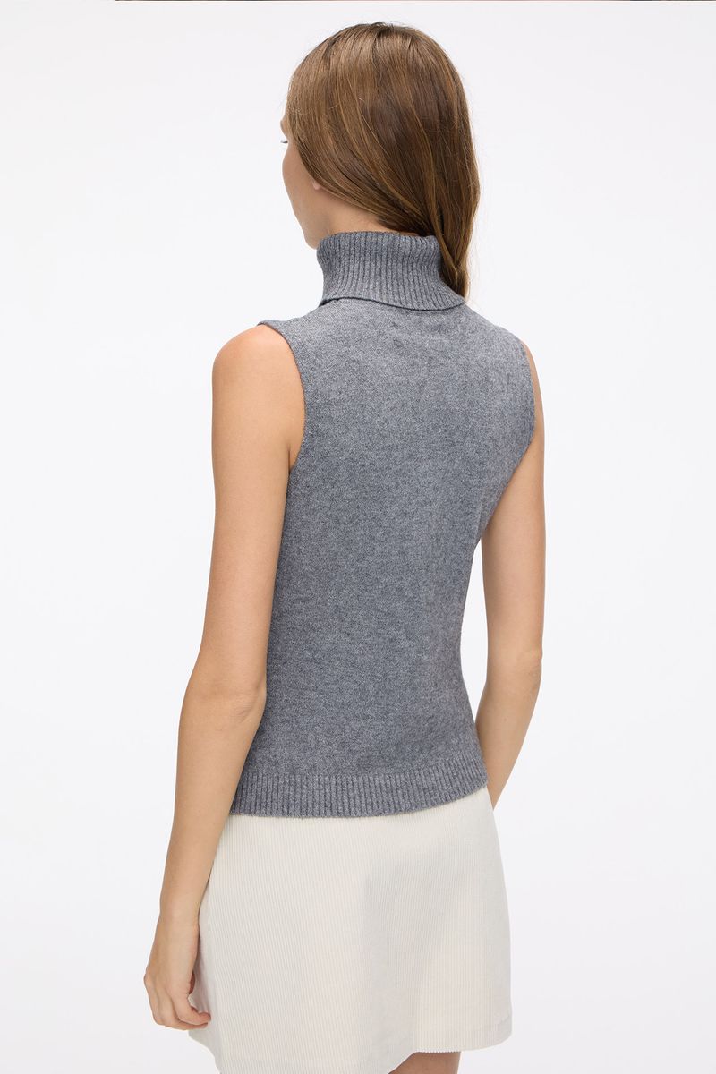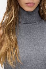 Chaleco con calce al cuerpo tejido en punto jersey, con cuello polera doble y cintura en punto ribb. La modelo está usando talle 40. Composición: 55% Rayón Viscosa | 30% Poliamida | 15% Modal