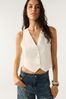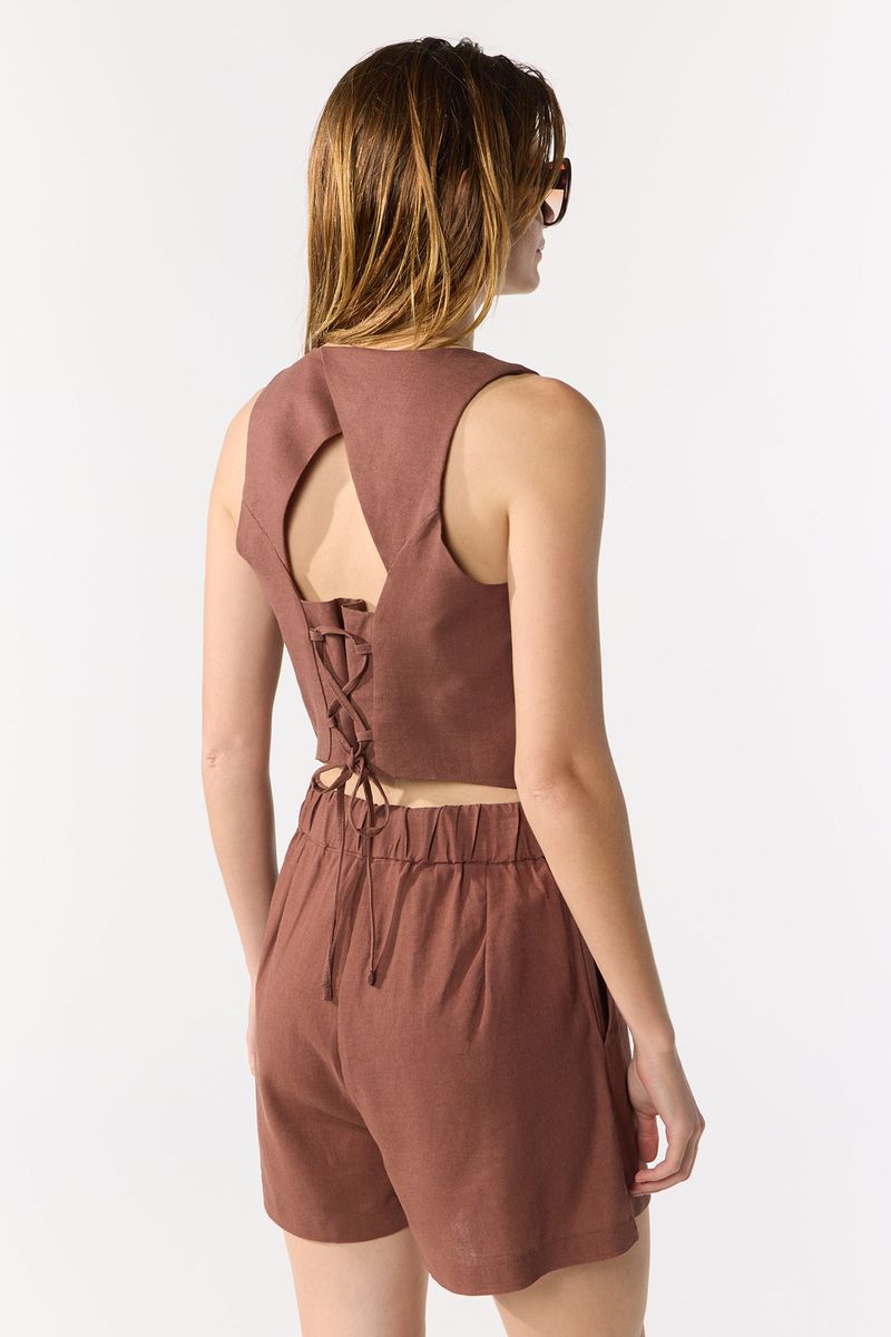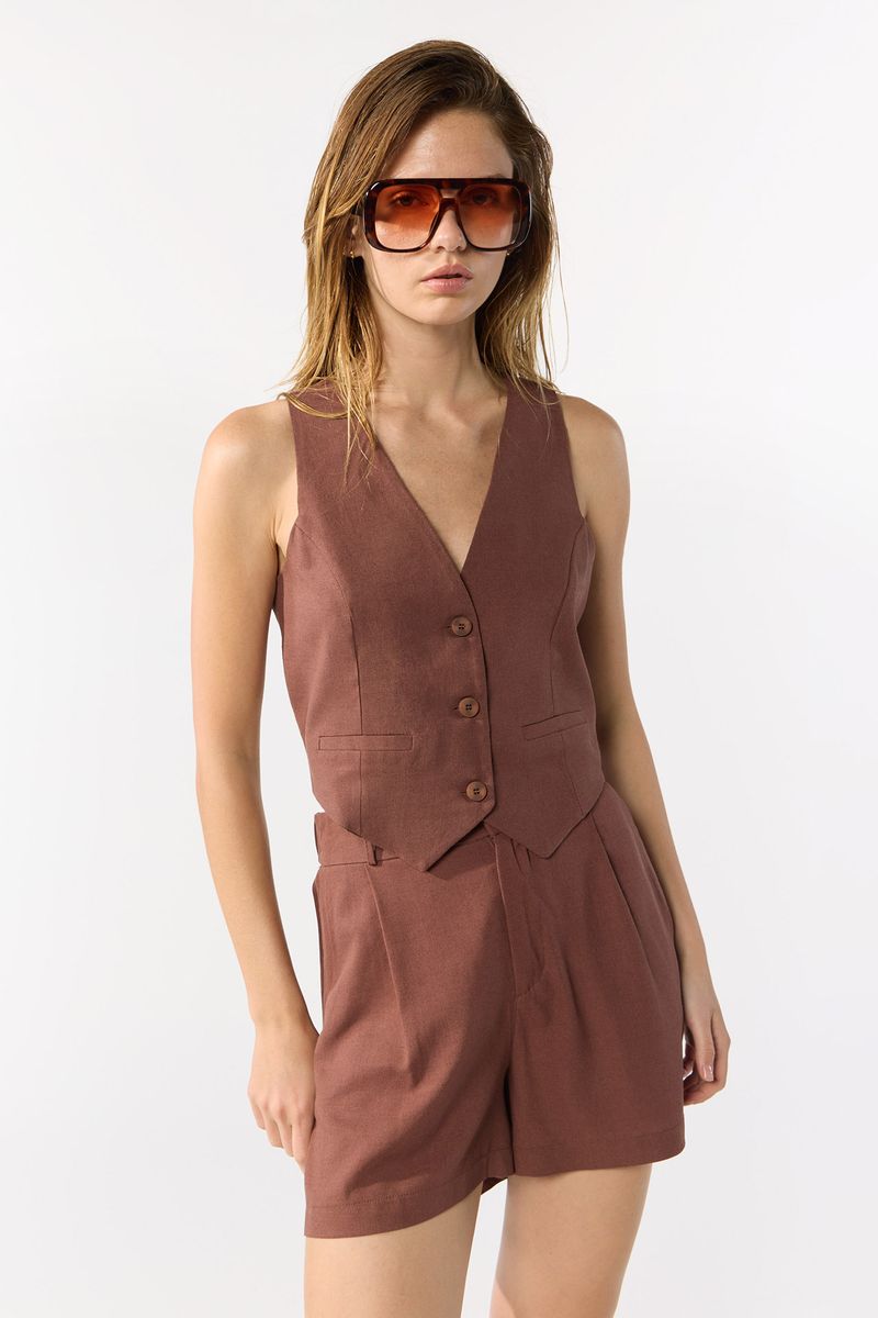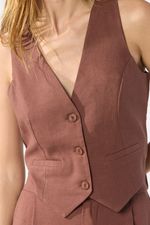 Chaleco en lino sastrero con 3 botones, bolsillos ojal. Tiene espalda cruzada con sustracción en centro y lazo para entalle. La modelo está usando talle 42. Composición: Tela 1: 55% Lino | 45% Rayón viscosa || Tela 2: 100% Poliéster