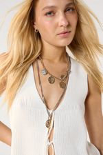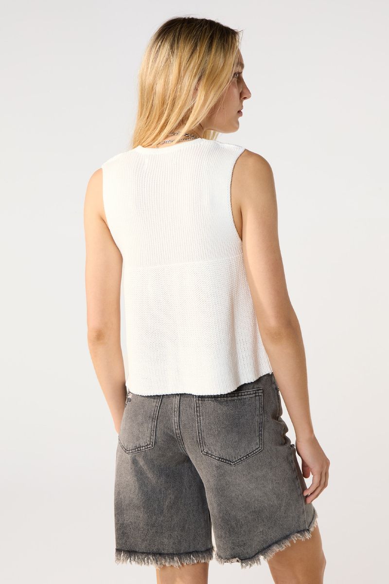 Chaleco tejido con escote en v y cordones en el delantero. La modelo está usando talle 42. Composición: 100% Poliéster