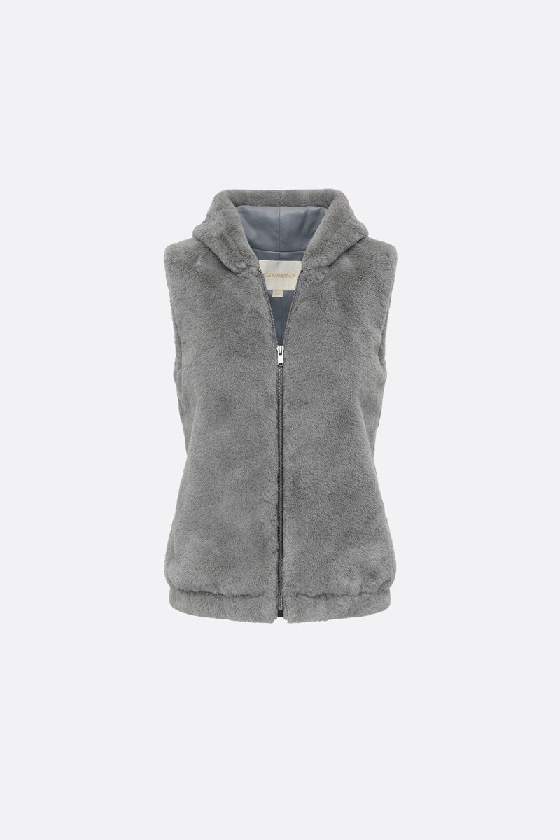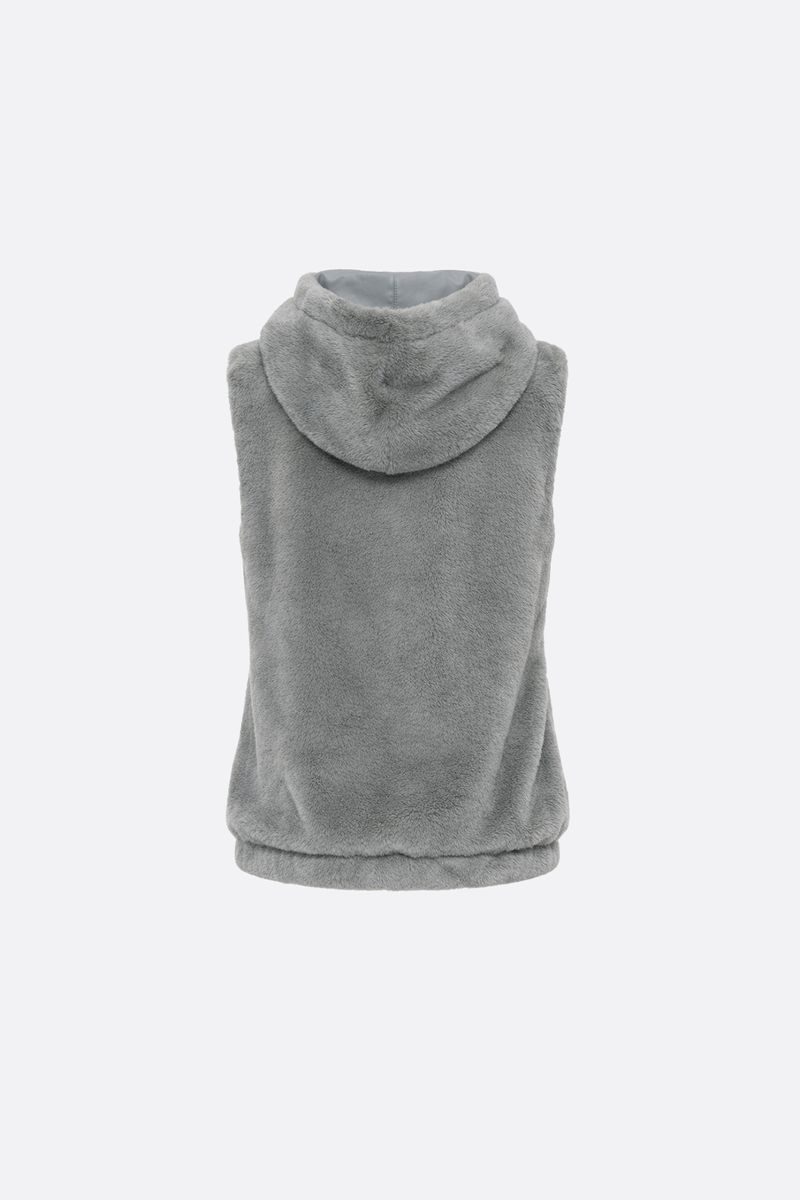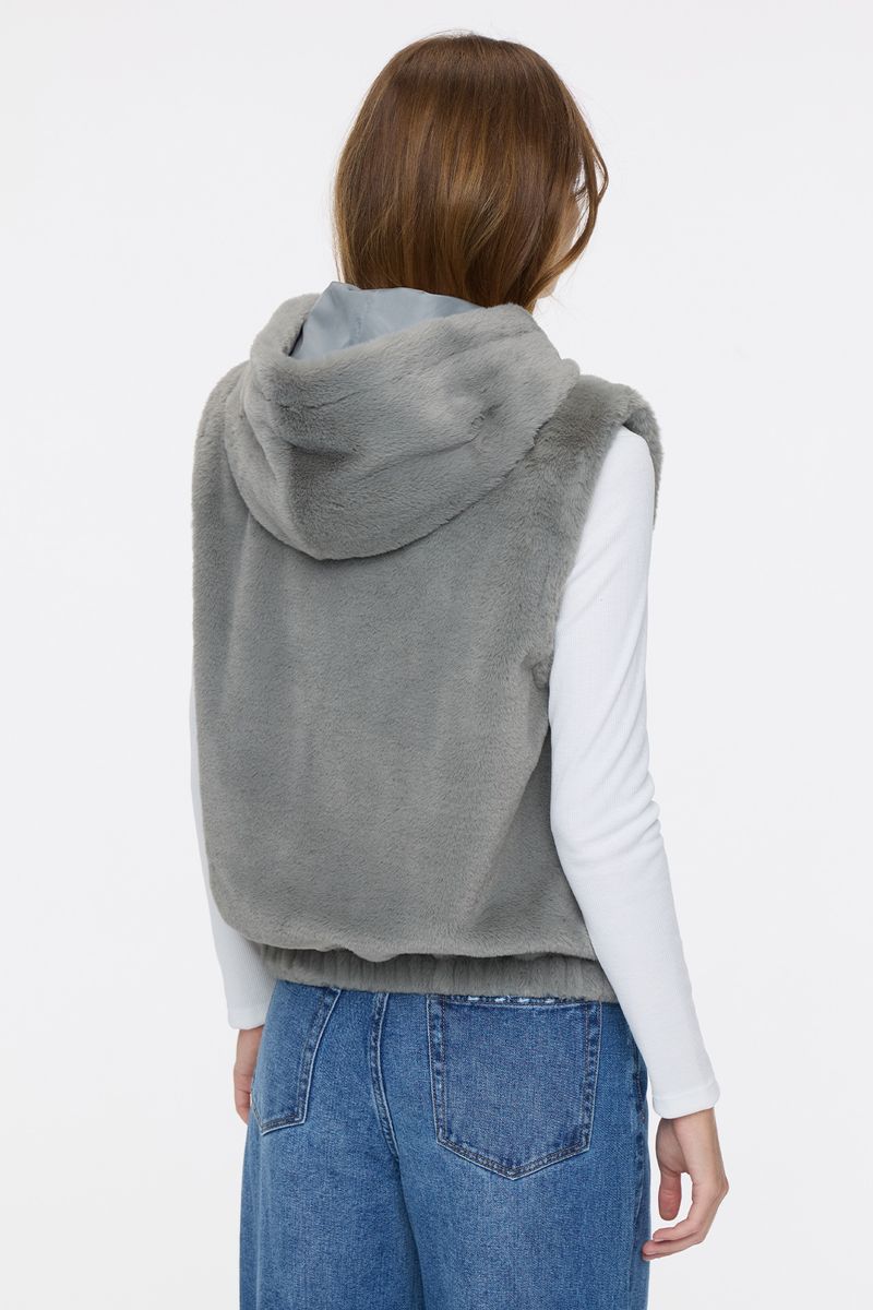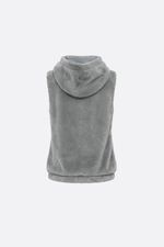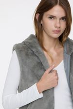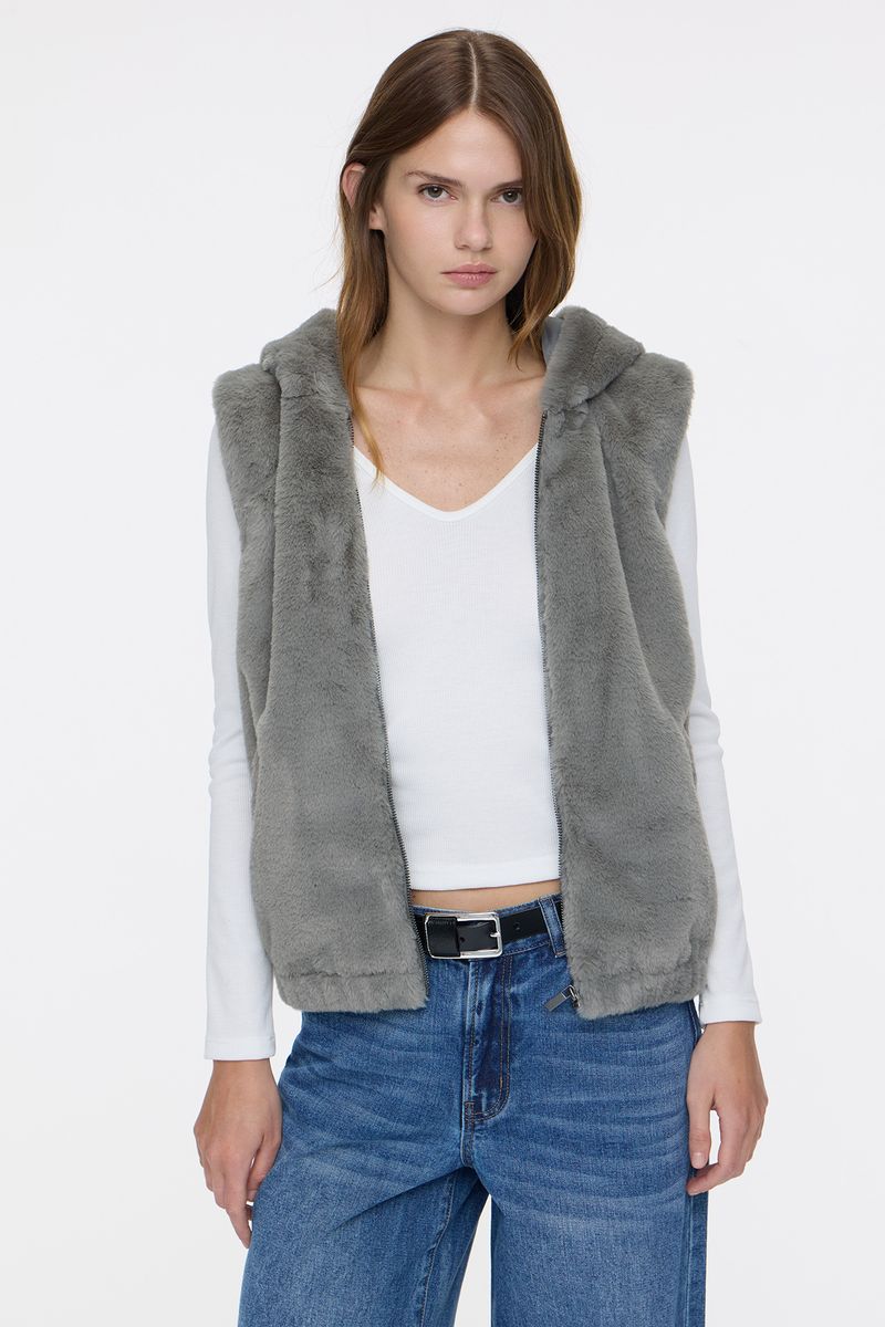 Chaleco de pelo simil piel, forrado. Acceso frontal mediante cierre metálico. Posee capucha, bolsillos en el delantero y cintura con elástico. La modelo está usando talle 42. Composición: 100% Poliéster