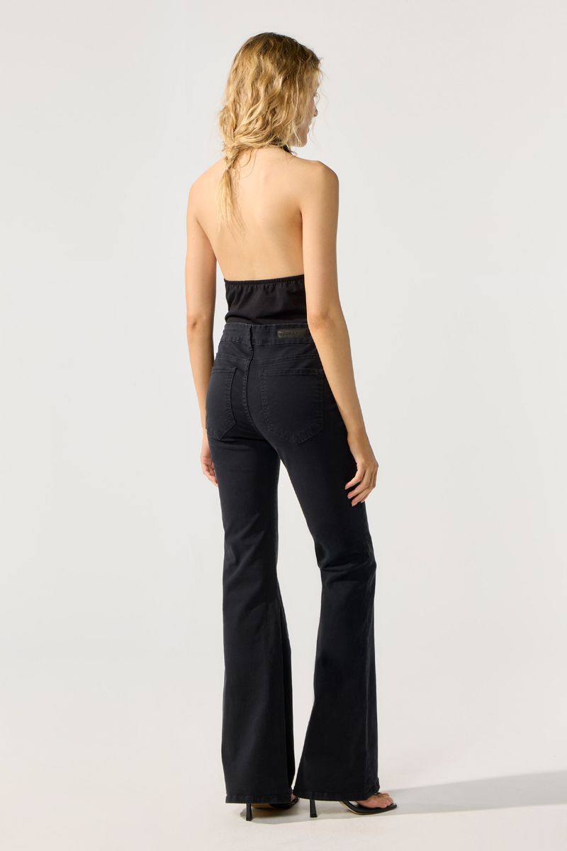 Pantalón flare, tiro medio pierna semi oxford de bull elastizado color negro,cinco bolsillos. Hilo al tono. La modelo está usando talle 42. Composicion: 98% Algodón | 2% Elastano
