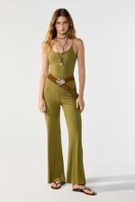 Mono largo palazzo en morley liso con breteles finos en cola de rata y escote con vista interna. Tiene presillas en laterales y lazo en cintura. La modelo está usando talle 42. Composición: 93% Rayón viscosa | 7% Elastano