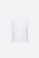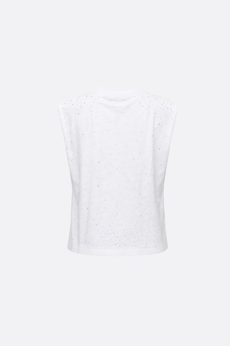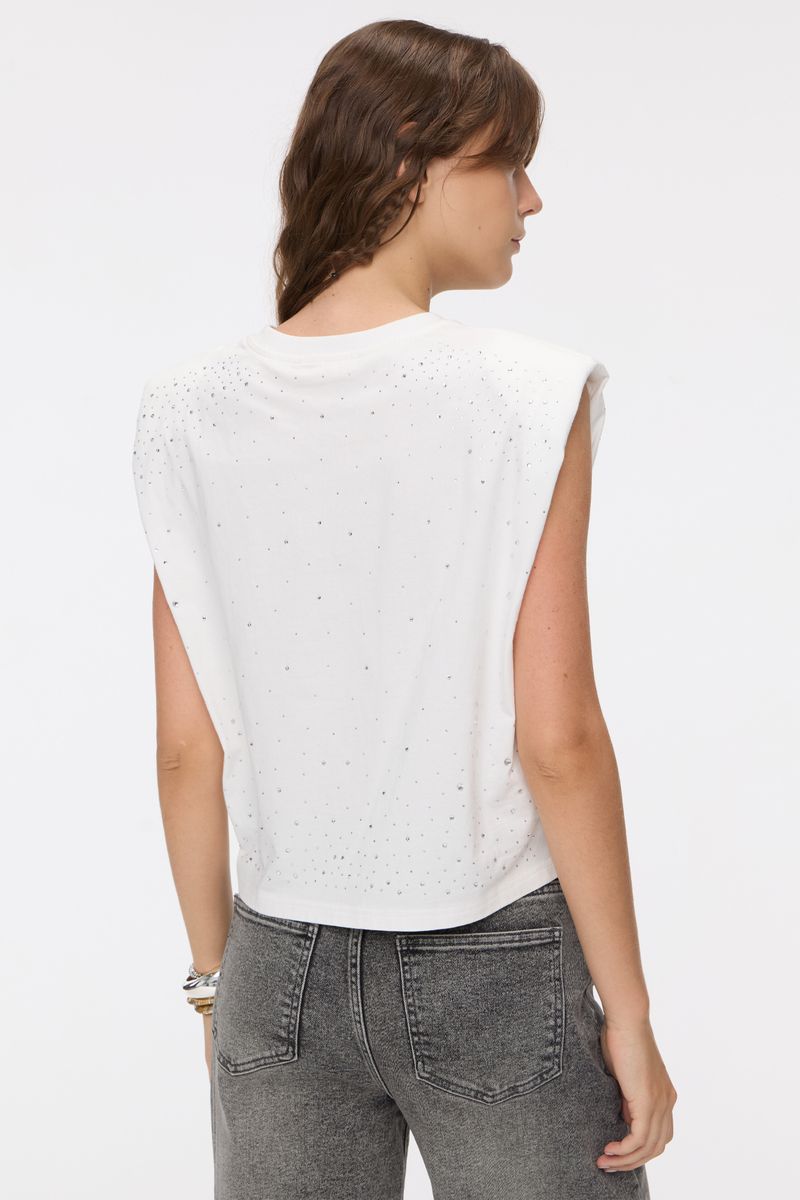 Musculosa de algodón con escote redondo y cuello en ribb. Lleva hotfix en delantero y espalda aplicados con efecto degradado desde hombros y ruedo hacia el centro. La modelo está usando talle 42. Composición: 100% Algodón