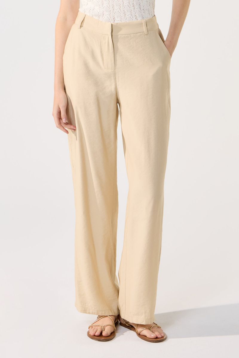 Pantalón en sastrero liviano de calce wide. Cintura con presillas y gancho pantalonero. Tiene bolsillos en laterales. La modelo está usando talle 42. Composición: 85% Rayón viscosa | 15% Poliéster