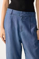 Pantalón recto de liocel. Tiene cintura con presillas. Se accede en el delantero con gancho pantalonero y cierre. Tiene bolsillos en laterales. La modelo está usando talle 42. Composición: 100% Liocel