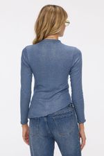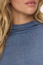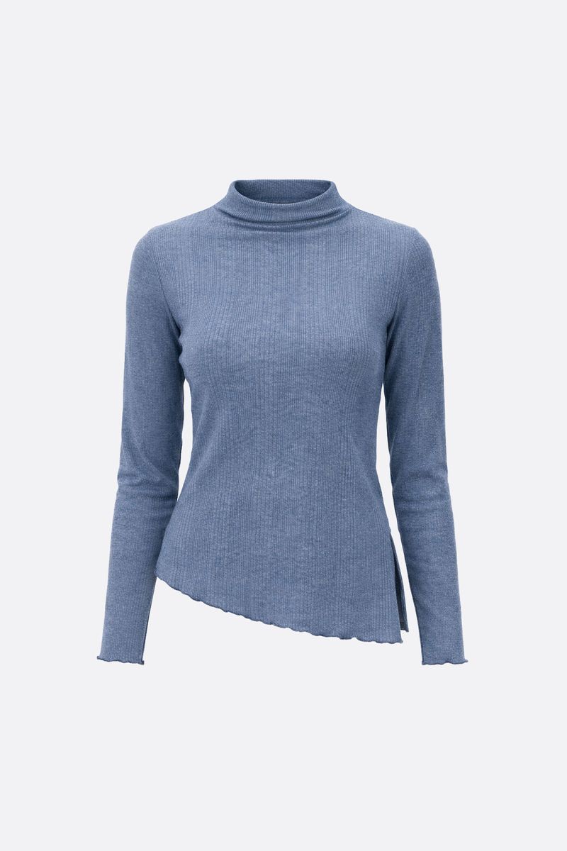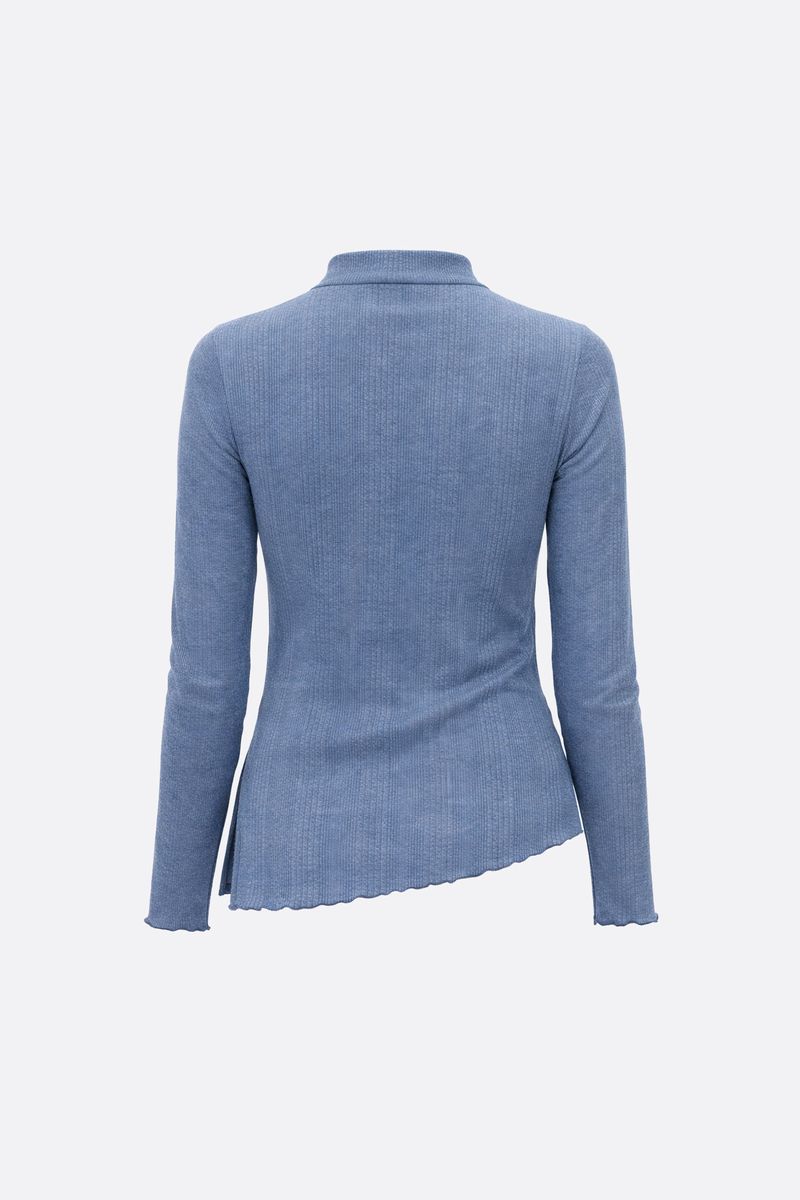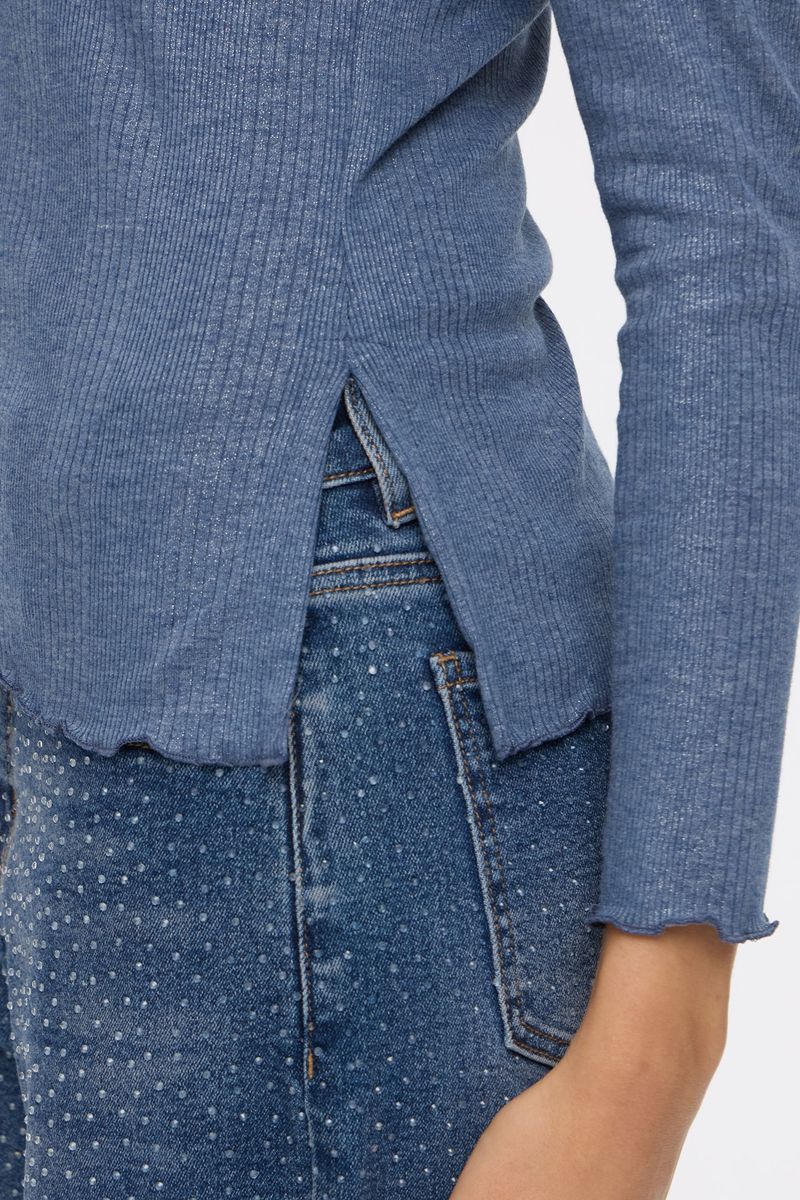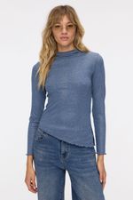 Polera en morley con foil, cuello medio polera sin costura y ruedo asimétrico con terminación en roulotte. La modelo está usando talle 42. Composición: 65% Poliéster | 28% Rayón viscosa | 7% Elastano