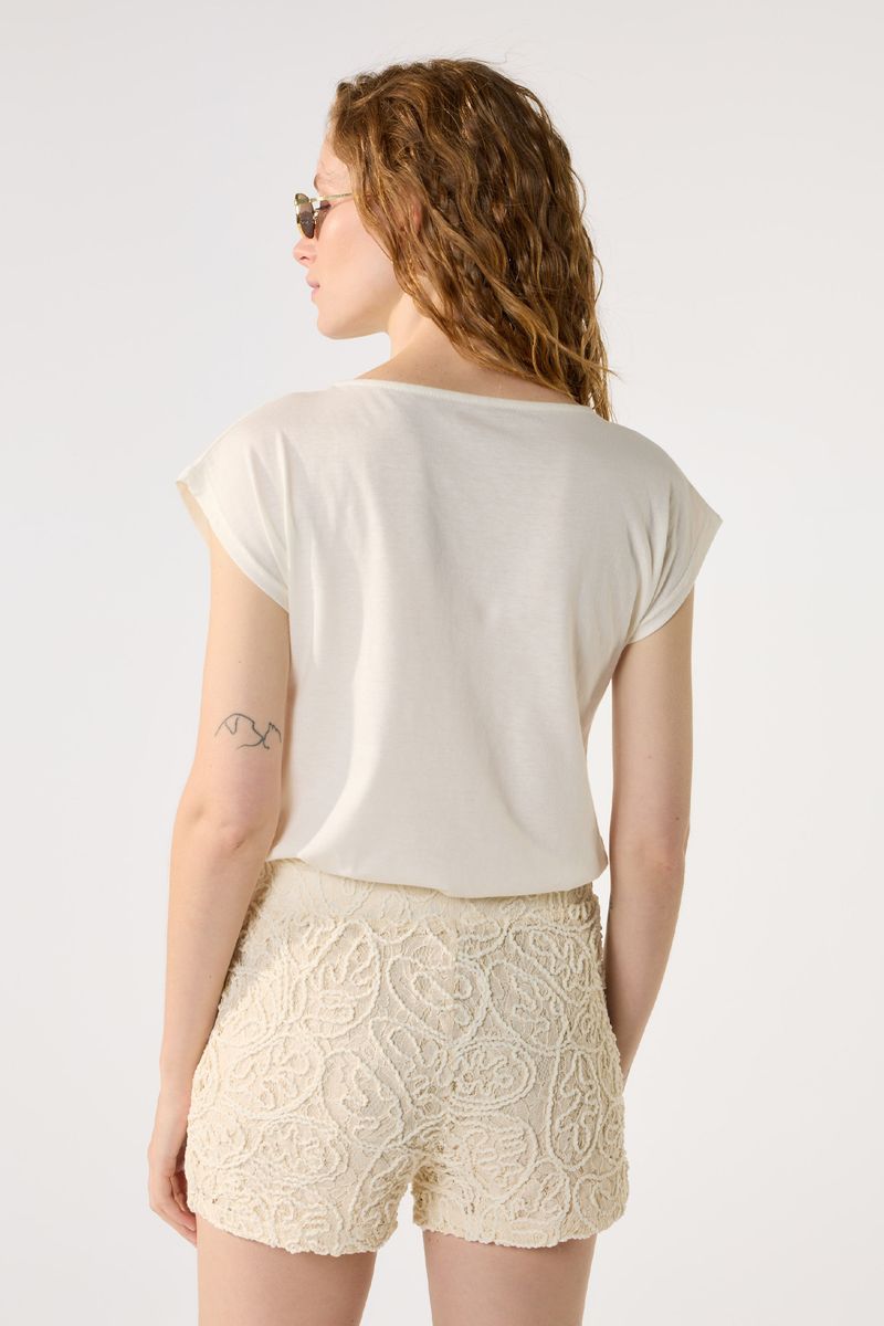 Remera lisa en jersey, escote en v con puntilla de tul bordada. La modelo está usando talle 42. Composición: 100% Algodón