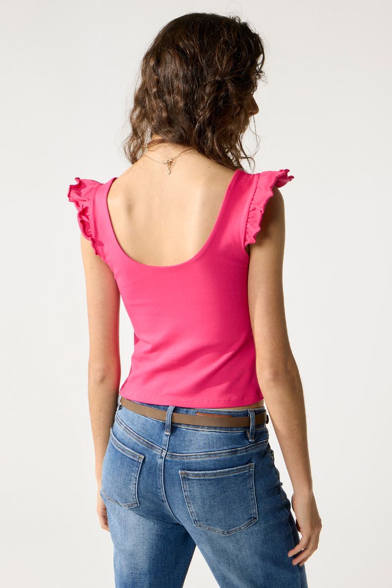 Remera lisa al cuerpo en jersey con escote pronunciado con vista interna. Tiene volados en sisas en rib a tono con terminación en roulotte. La modelo está usando talle 42. Composición: 93% Algodón | 7% Elastano
