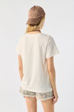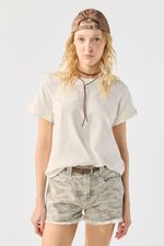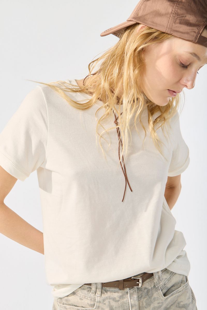 Remera lisa manga corta en jersey, escote redondo.Tiene avío de entredós en mangas. La modelo está usando talle 42. Composición: 100% Algodón