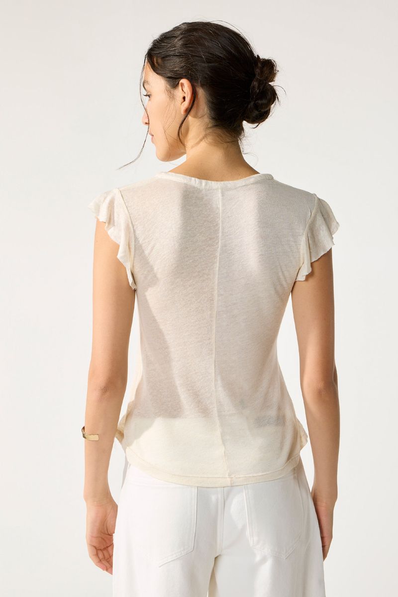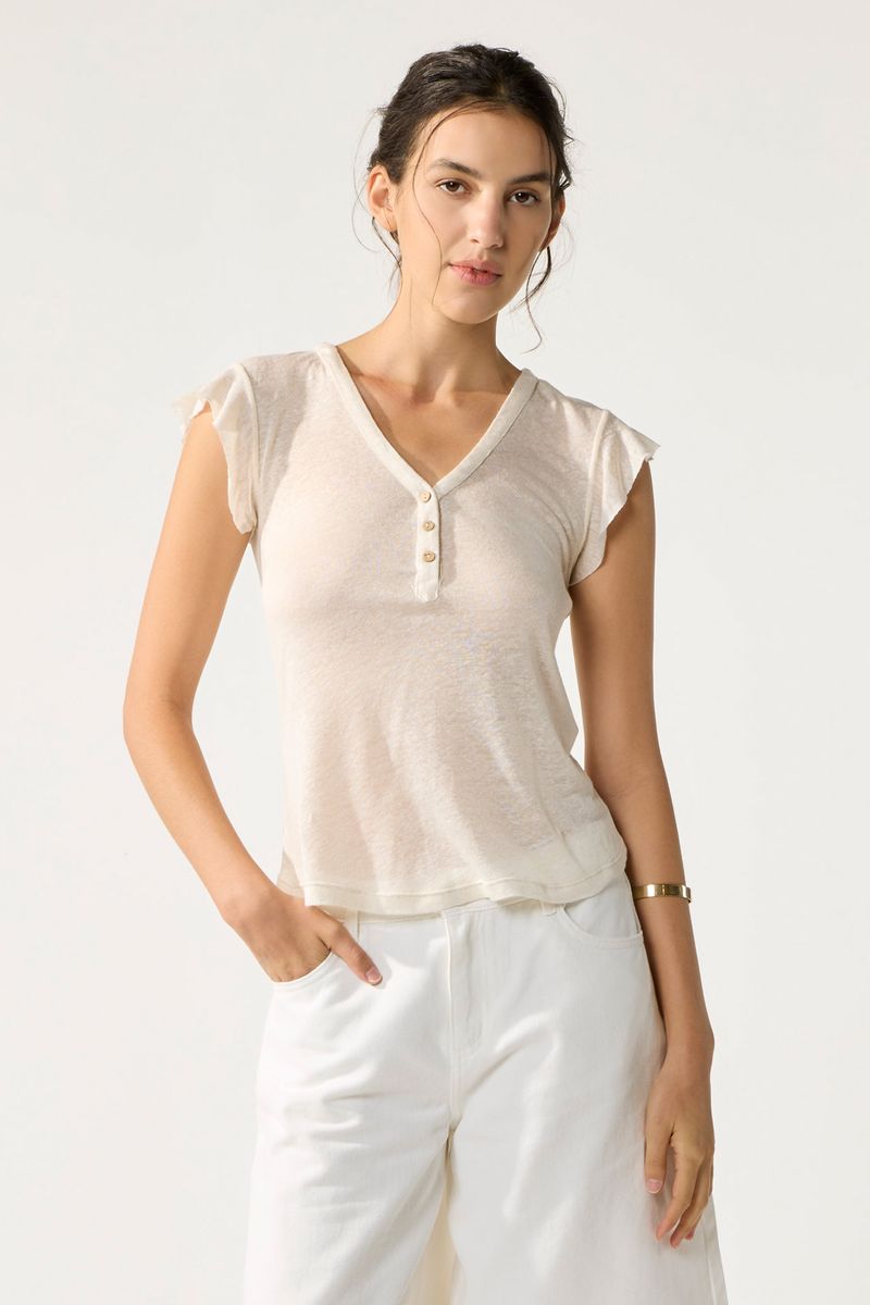 Remera lisa en jersey lino, escote en v con cartera y botones de coco.Tiene mangas volado con terminación al corte. La modelo está usando talle 42. Composición: 60% Rayón viscosa | 40% Lino