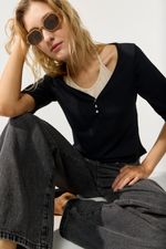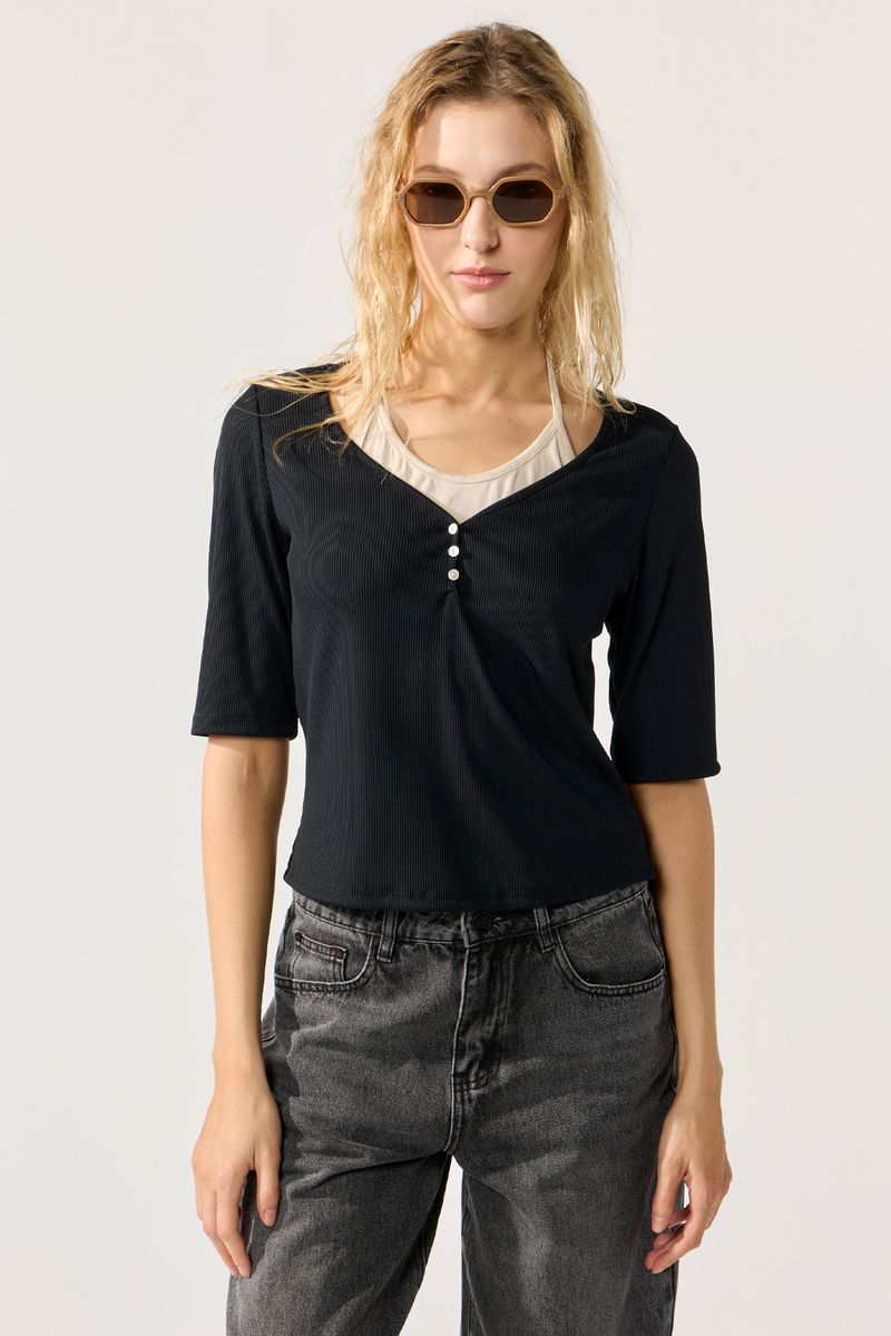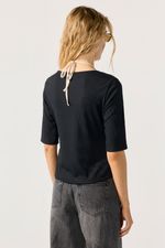 Remera lisa de morley manga al codo, con cartera y top falso interno a contra tono lleva lazo. La modelo está usando talle 42. Composición: Tela 1: 96% Poliéster | 4% Elastano