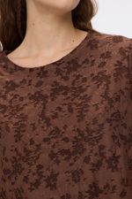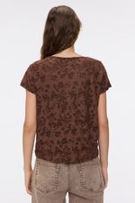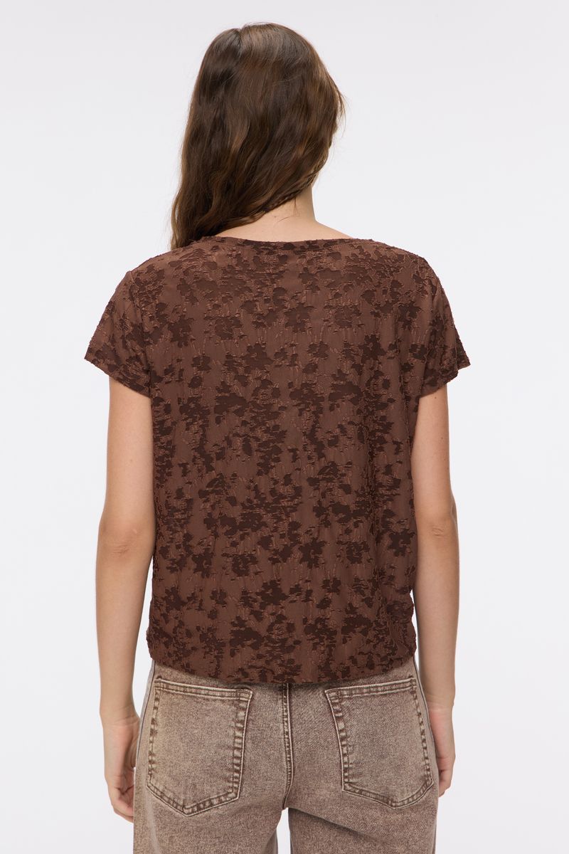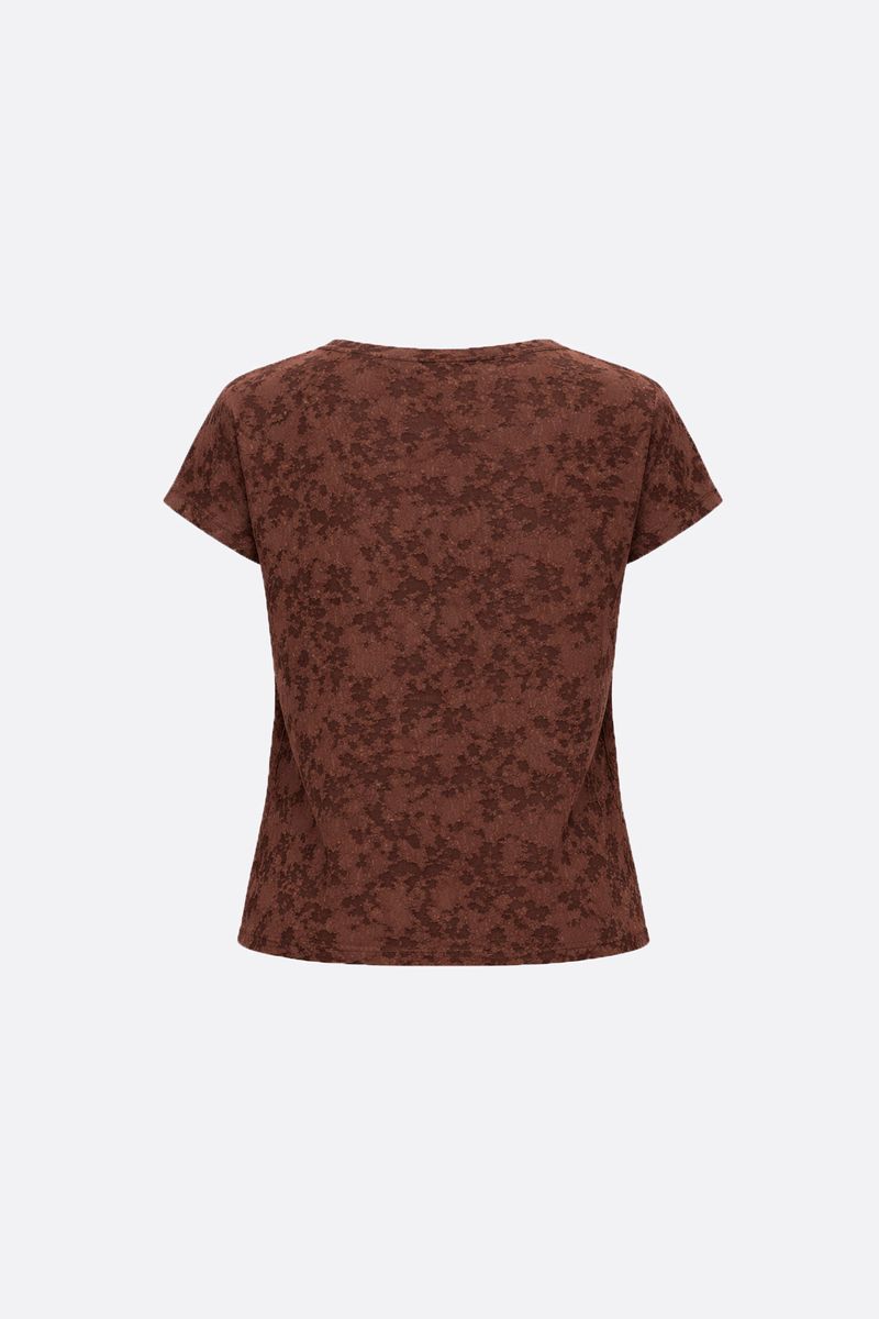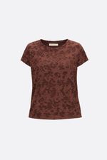 Remera en devore, escote redondo y mangas cortas. La modelo está usando talle 42. Composición: 95% Poliéster | 5% Elastano