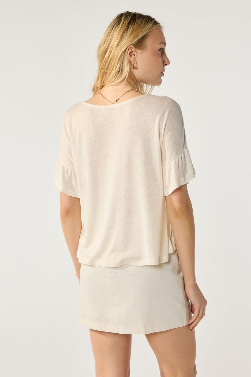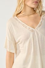 Remera lisa en jersey lino, escote en V con recorte en encaje y recorte de bajo