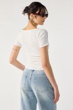 Remera lisa en morley de algodón, escote ovalado con puntilla de encaje y mangas cortas.Tiene terminaciones en roulotte en ruedo de manga y ruedo de cuerpo. La modelo está usando talle 42. Composición: 68% Poliéster | 29% Rayón viscosa | 3% Elastano