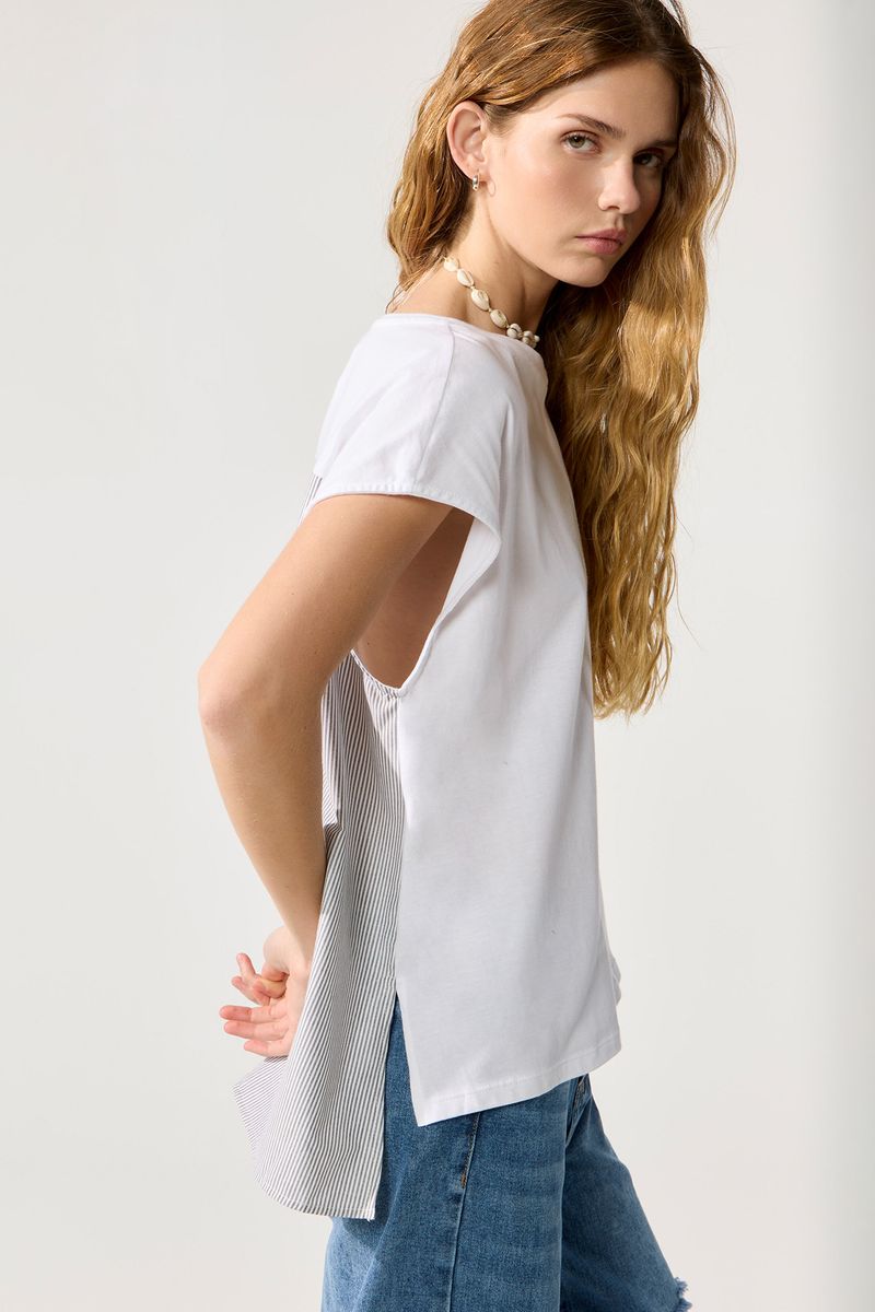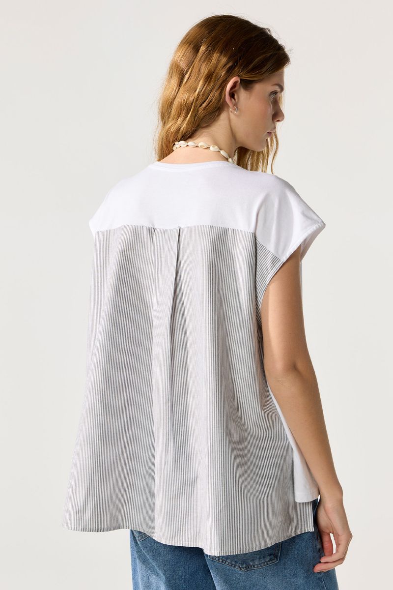 Remerón sin mangas, frente y canesú en algodón, espalda en tela rallada. Detalle de tabla en la espalda. La modelo está usando talle S. Composición: 100% Algodón