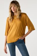 Remeron liso en jersey viscosa con escote redondo y mangas al codo con abertura. Tiene ruedo escalonado con tajos en laterales La modelo está usando talle 42 Composición: 96% Rayón viscosa | 4% Elastano