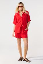 Short liso, con cintura elastizada y bolsillos en laterales. La modelo está usando talle 42. Composición: 70% Rayón viscosa | 30% Lino