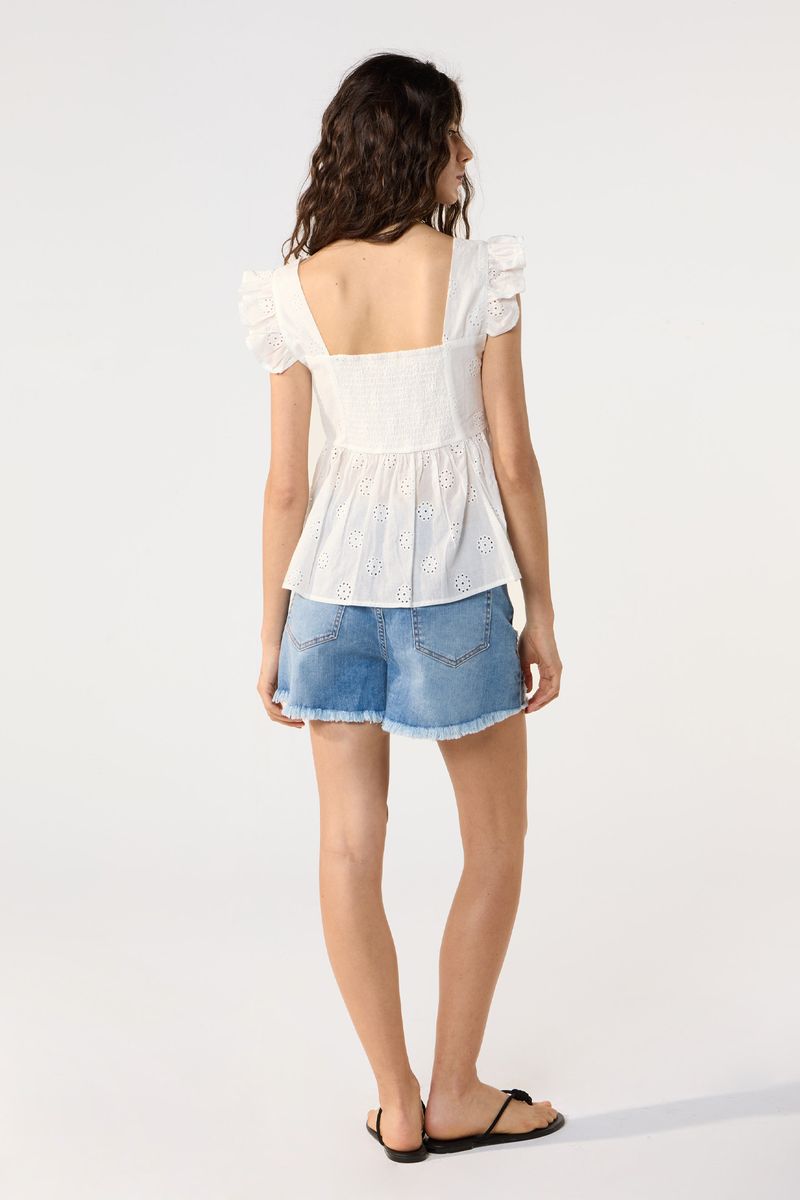 Short de denim color azul tejido semi rígido con proceso de lavado con localizado y diferentes roturas. Tiro alto con pierna angosta, dobladillo al corte y hilo a contratono. La modelo está usando talle 42. Composición: 99% Algodón | 1% Elastano