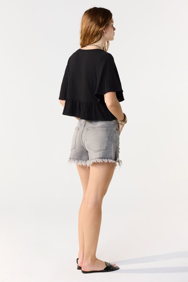 Short de denim color gris con proceso de lavado y pequeñas roturas , 5 bolsillos con calce ajustado. Ruedo desflecado. Hilo al tono. La modelo está usando talle 42. Composición: 92,6% Algodón | 3,9% Poliéster | 3,5% Rayón viscosa