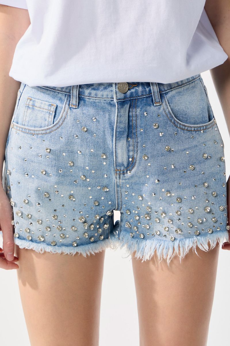Short de jean rígido, cinco bolsillos azul claro con detalles de strass aplicados en el frente y ruedo deflecado. La modelo está usando talle 42. Composición: 92.6% Algodón | 3.9% Poliéster | 3.5% Rayón viscosa